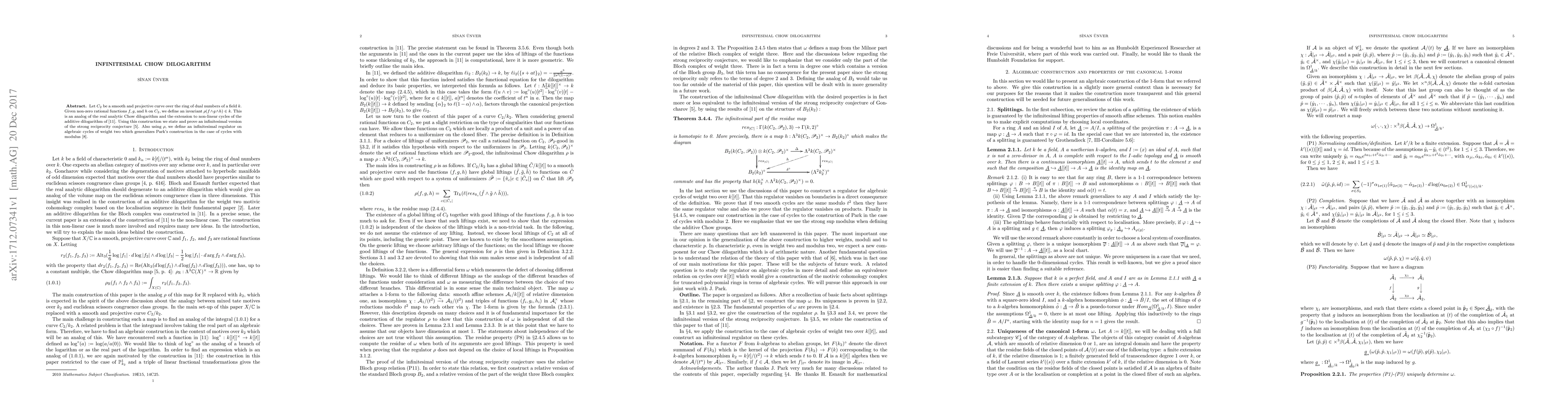 Let $C_{2}$ be a smooth and projective curve over the ring of dual numbers of a field $k.$ Given non-zero rational functions $f,g,$ and $h$ on $C_{2},$ we define an invariant $\rho(f\wedge g \wedge h) \in k.$ This is an analog of the real analytic Chow dilogarithm and the extension to non-linear cycles of the additive dilogarithm. Using this construction we state and prove an infinitesimal version of the strong reciprocity conjecture. Also using $\rho,$ we define an infinitesimal regulator on algebraic cycles of weight two which generalizes Park's construction in the case of cycles with modulus.
