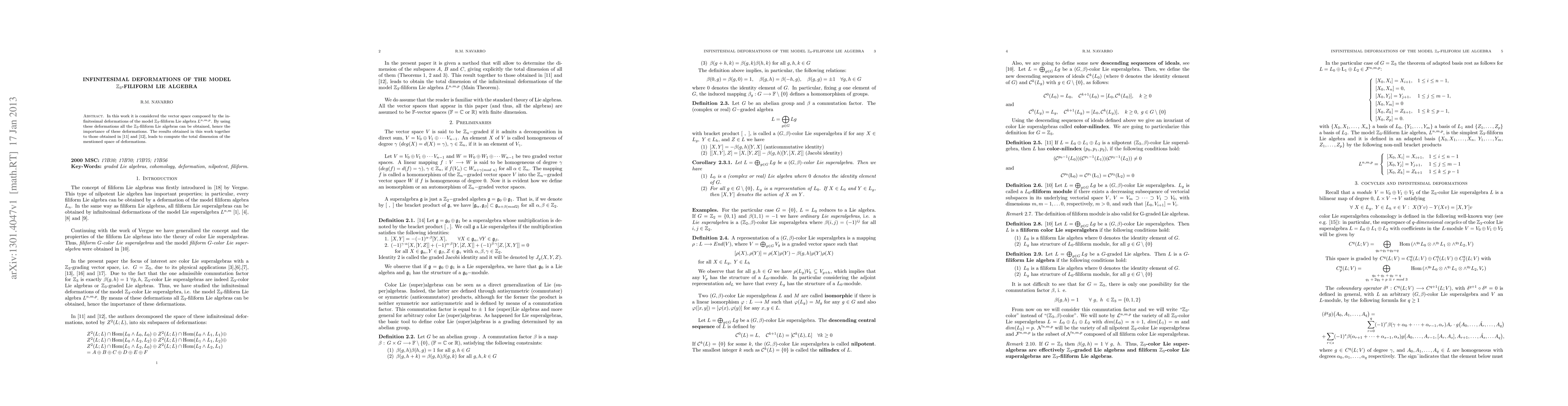In this work it is considered the vector space composed by the infinitesimal deformations of the model $\mathbb{Z}_3$-filiform Lie algebra $L^{n,m,p}$. By using these deformations all the $\mathbb{Z}_3$-filiform Lie algebras can be obtained, hence the importance of these deformations. The results obtained in this work together to those obtained in [Integrable deformations of nilpotent color Lie superalgebras, J. Geom. Phys. 61(2011)1797-1808] and [Corrigendum to Integrable deformations of nilpotent color Lie superalgebras, J. Geom. Phys. 62(2012)1571], leads to compute the total dimension of the mentioned space of deformations.