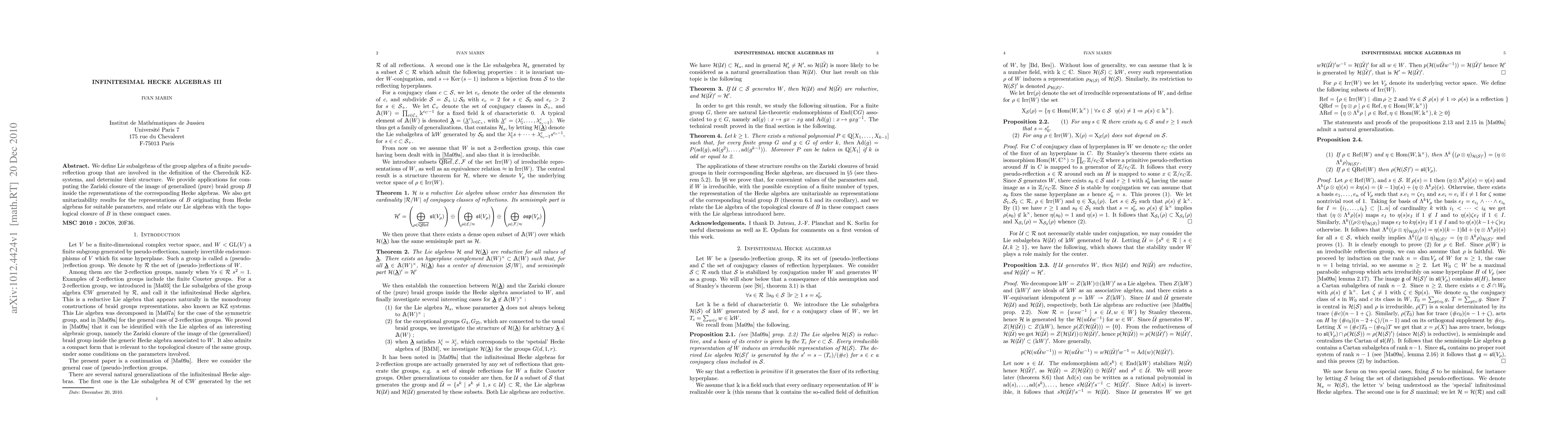 We define Lie subalgebras of the group algebra of a finite pseudo-reflection group that are involved in the definition of the Cherednik KZ-systems, and determine their structure. We provide applications for computing the Zariski closure of the image of generalized (pure) braid group B inside the representations of the corresponding Hecke algebras. We also get unitarizability results for the representations of B originating from Hecke algebras for suitable parameters, and relate our Lie algebras with the topological closure of B in these compact cases.