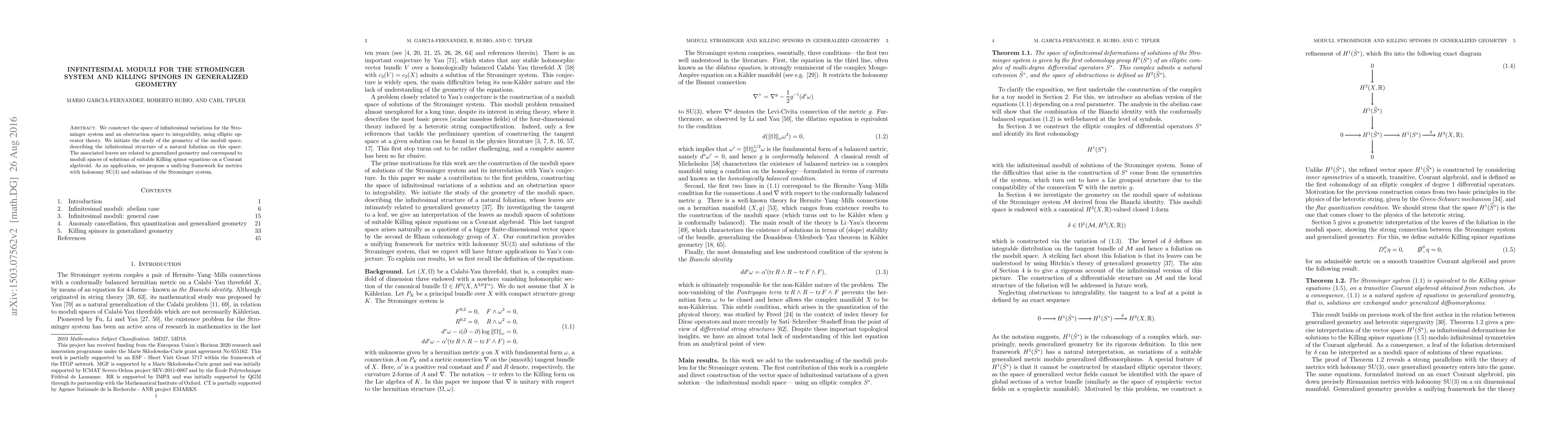 This paper constructs the infinitesimal moduli space for the Strominger system and identifies an obstruction space for its integrability, employing elliptic operator theory. It explores the geometry of this space, linking its foliation to generalized geometry and Killing spinor equations on a Courant algebroid, and proposes a unifying framework for $\SU(3)$ holonomy metrics and Strominger system solutions.