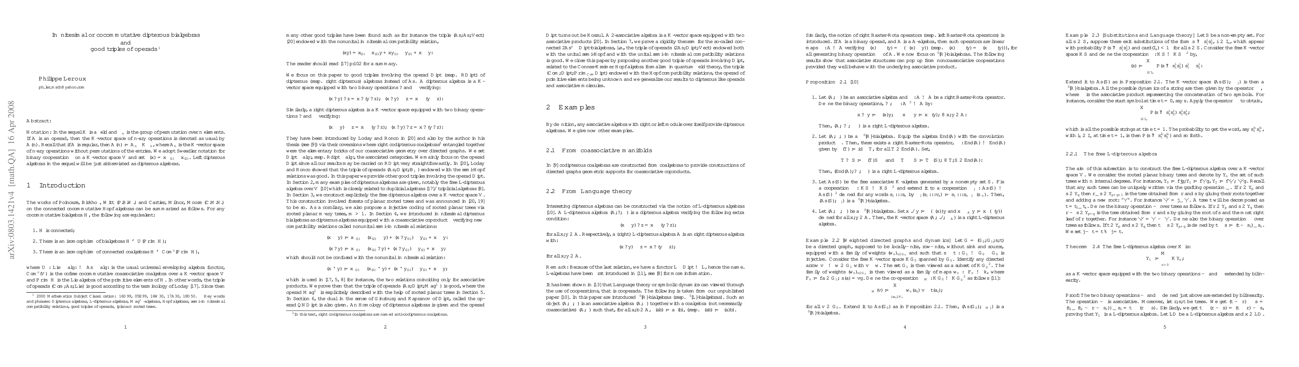 The works of Poincare, Birkhoff, Witt and Cartier, Milnor, Moore on the connected cocommutative Hopf algebras translated in the language of operads means that the triple of operads (Com, As, Lie) endowed with the Hopf compatiblity relation is good. In this paper, we focus on left dipterous (resp. right dipterous) algebras which are associative algebras with an extra left (resp. right) module on themselves and look for good triples were $As$ is replaced by the dipterous operad Dipt. Since the work of Loday and Ronco, the triple of operads (As, Dipt, B_\infty) endowed with the semi-Hopf compatibility relations is known to be good. In this paper, we prove that the triple of operads (As, Dipt, Grove) endowed with the so-called (nonunital) semi-infinitesimal compatibility relations is good. For that, explicit constructions of the free dipterous algebra and the free grove-algebra over a K-vector space V are given. These constructions turn out to be related to rooted planar trees and the little an large Schroeder numbers. Many examples of dipterous algebras are given, notably the free L-dipterous algebras. As a corollary of our results, we also recover that the triple of operads (2As, Dipt, Vect) endowed both with the unital semi-Hopf and with the unital semi-infinitesimal compatibility relations is good, where 2As denotes the operad of 2-associative algebras. We also open this paper on a good triple, related to the Connes-Kreimer Hopf algebra in quantum field theory, (Com, Dipt, Prim_{Com} Dipt) endowed with the Hopf compatibility relations and also present a general theorem giving good triples from entangled dipterous like operads named associative molecules.