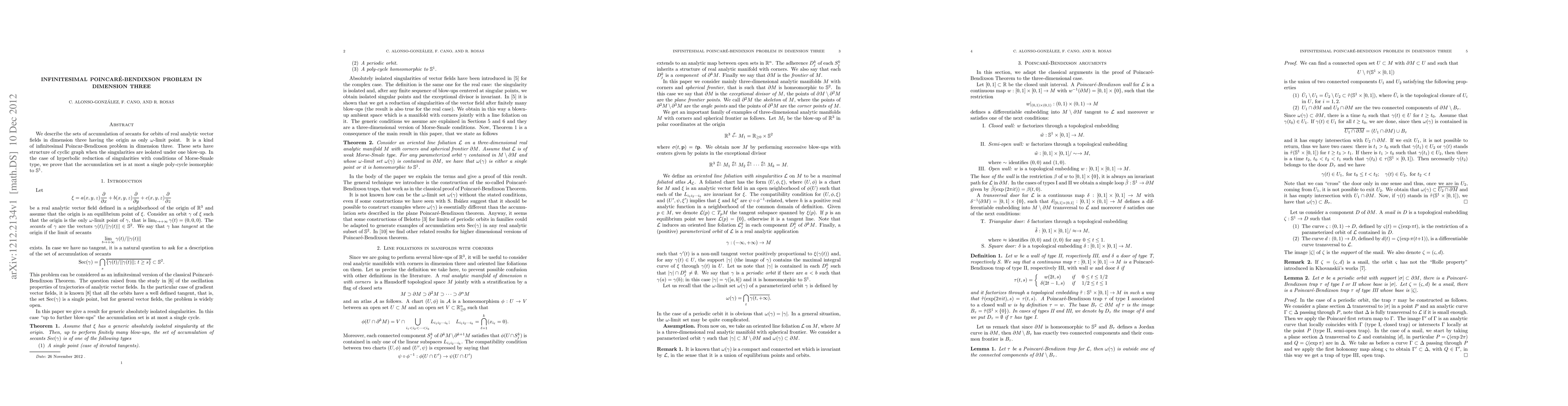 We describe the sets of accumulation of secants for orbits of real analytic vector fields in dimension three having the origin as only {\omega}-limit point. It is a kind of infinitesimal Poincar\'e-Bendixson problem in dimension three. These sets have structure of cyclic graph when the singularities are isolated under one blow-up. In the case of hyperbolic reduction of singularities with conditions of type Morse-Smale, we prove that the accumulation set is at most a single polycycle isomorphic to {\mathbb S}^1.