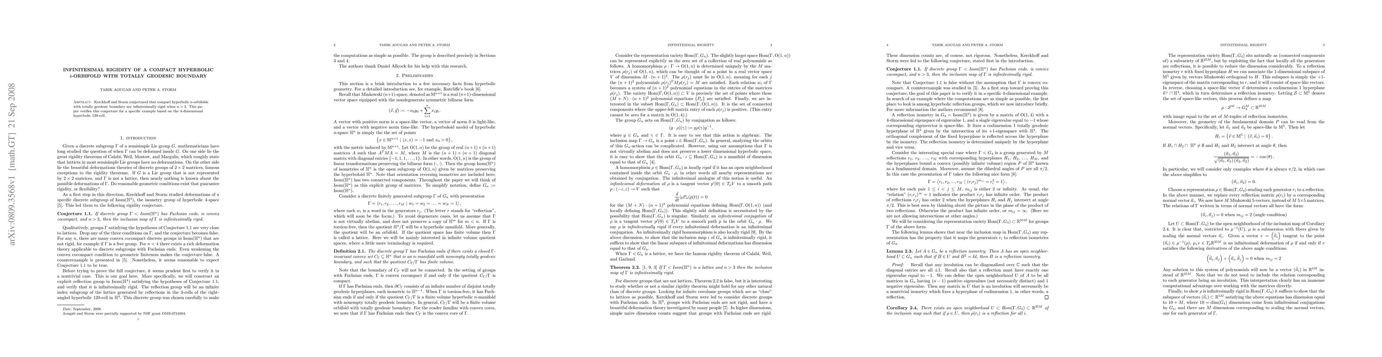 This paper confirms Kerckhoff and Storm's conjecture on the infinitesimal rigidity of compact hyperbolic n-orbifolds with totally geodesic boundary for n>3, specifically for the 4-dimensional hyperbolic 120-cell. The study provides a detailed analysis of this specific example.