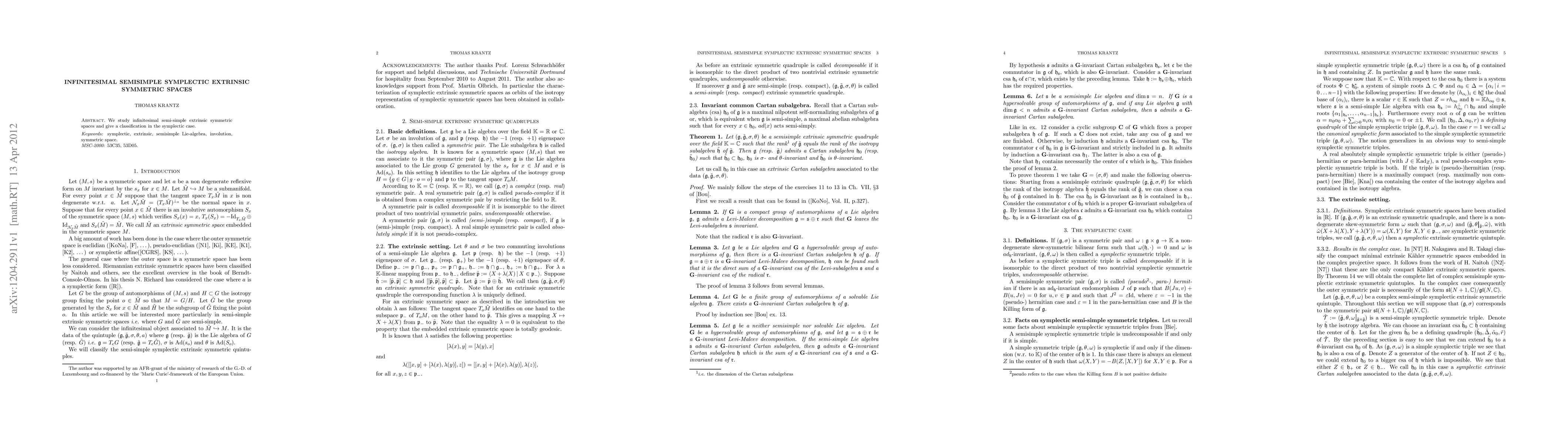 This paper classifies infinitesimal semi-simple extrinsic symmetric spaces in the symplectic case, providing a detailed examination of their structure and properties.