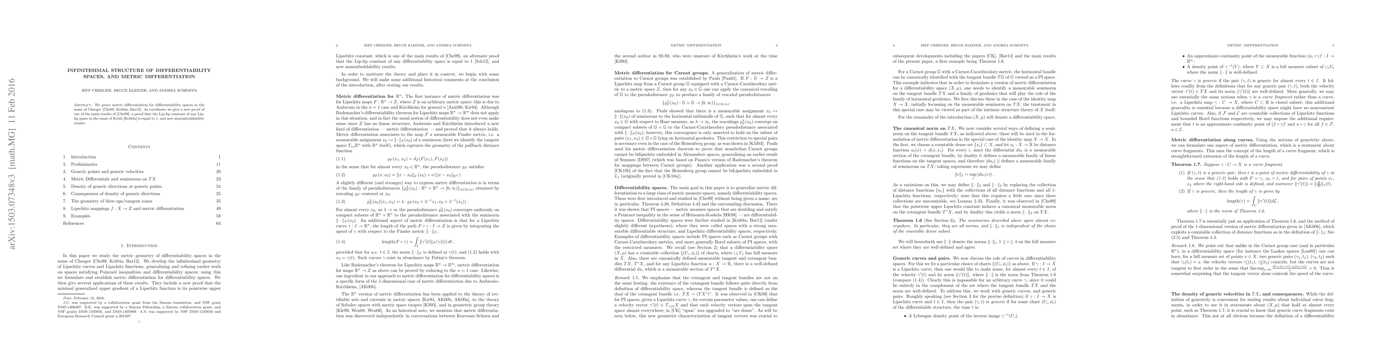 We prove metric differentiation for differentiability spaces in the sense of Cheeger. As corollaries we give a new proof that the minimal generalized upper gradient coincides with the pointwise Lipschitz constant for Lipschitz functions on PI spaces, a proof that the Lip-lip constant of any Lip-lip space in the sense of Keith is equal to $1$, and new nonembeddability results.