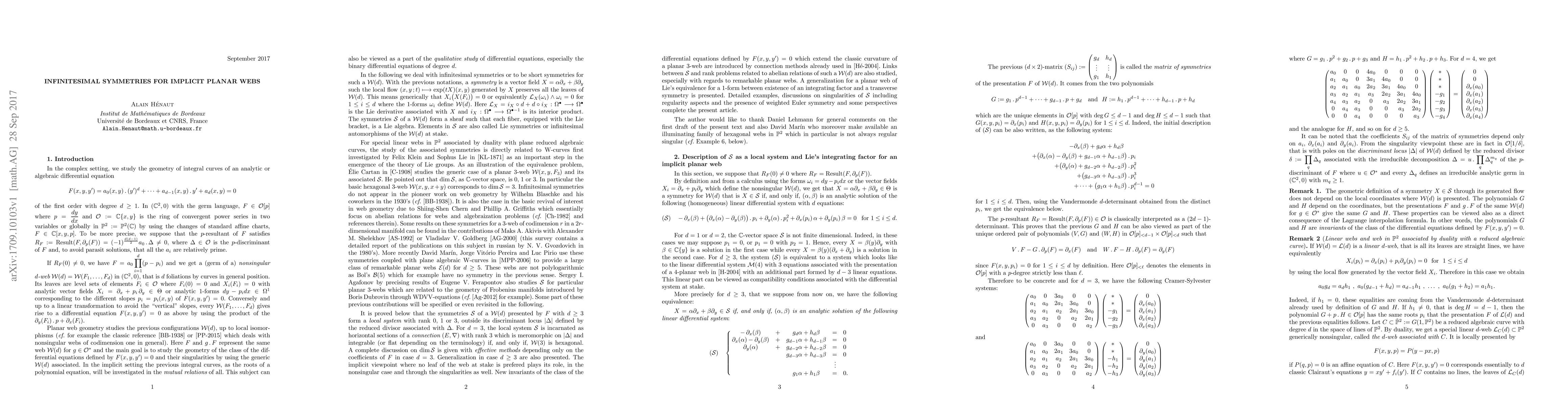 In the complex setting, let $F(x,y,y')=0$ be an analytic or algebraic differential equation with $y'$-degree $d$. We deal with the qualitative study of such equations through the geometry of the planar $d$-web generated by the generic family of integral curves. Infinitesimal symmetries of these configurations are discussed by using meromorphic connections methods "\`a la Cartan-Spencer".