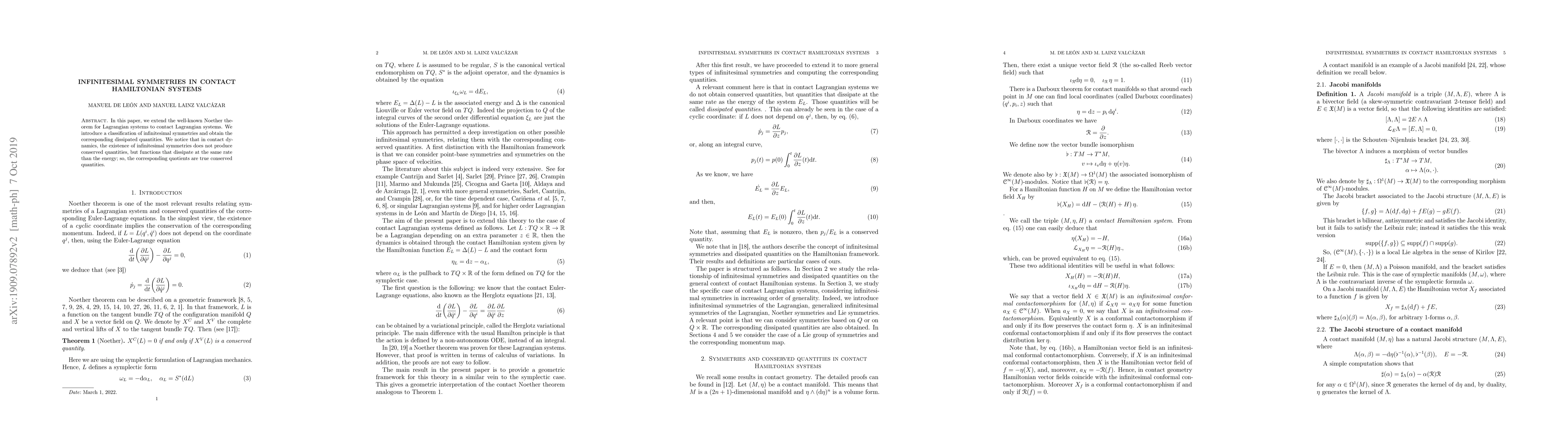 This paper extends Noether's theorem to contact Lagrangian systems, classifying infinitesimal symmetries and identifying dissipated quantities. Unlike in Lagrangian systems, these symmetries do not yield conserved quantities but rather functions that dissipate at the same rate as energy, with their quotients serving as true conserved quantities.