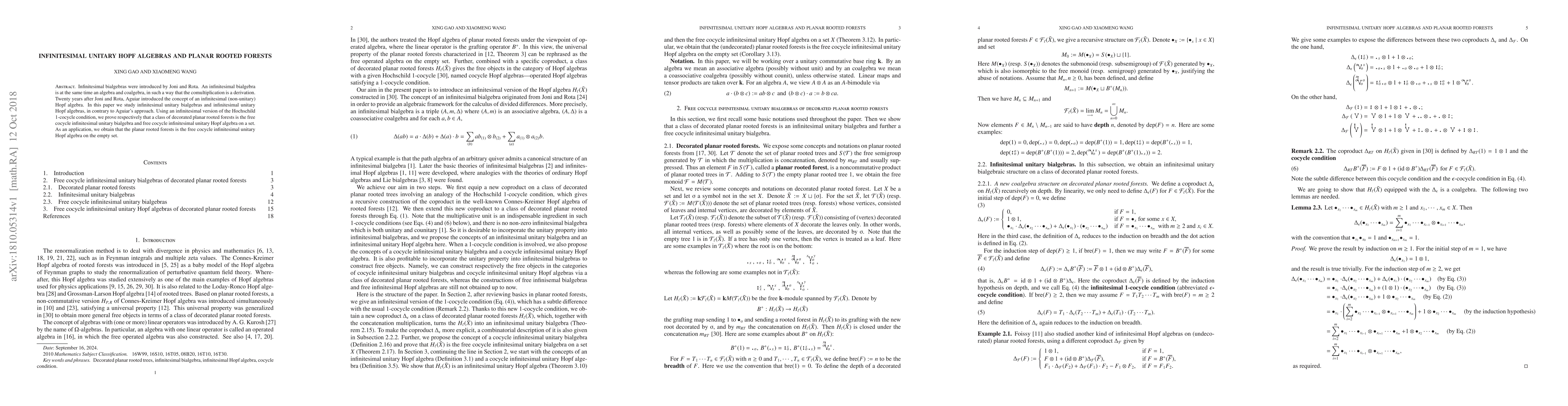 This paper explores infinitesimal unitary Hopf algebras and their connection to decorated planar rooted forests, proving that these forests form the free cocycle infinitesimal unitary Hopf algebra on a set and on the empty set. The study employs an infinitesimal version of the Hochschild 1-cocycle condition to establish these results.