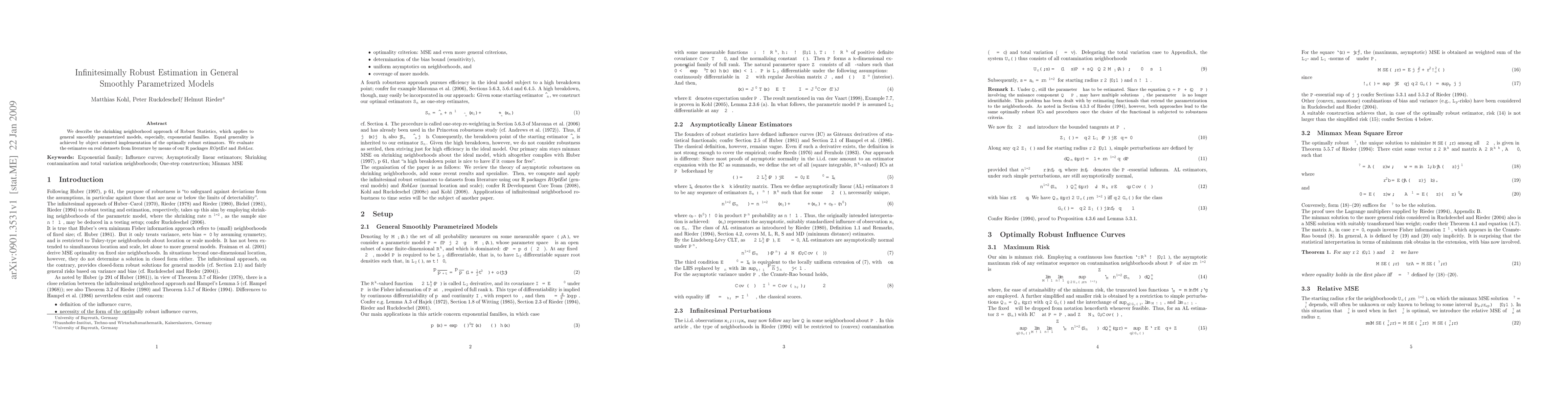 We describe the shrinking neighborhood approach of Robust Statistics, which applies to general smoothly parametrized models, especially, exponential families. Equal generality is achieved by object oriented implementation of the optimally robust estimators. We evaluate the estimates on real datasets from literature by means of our R packages ROptEst and RobLox.