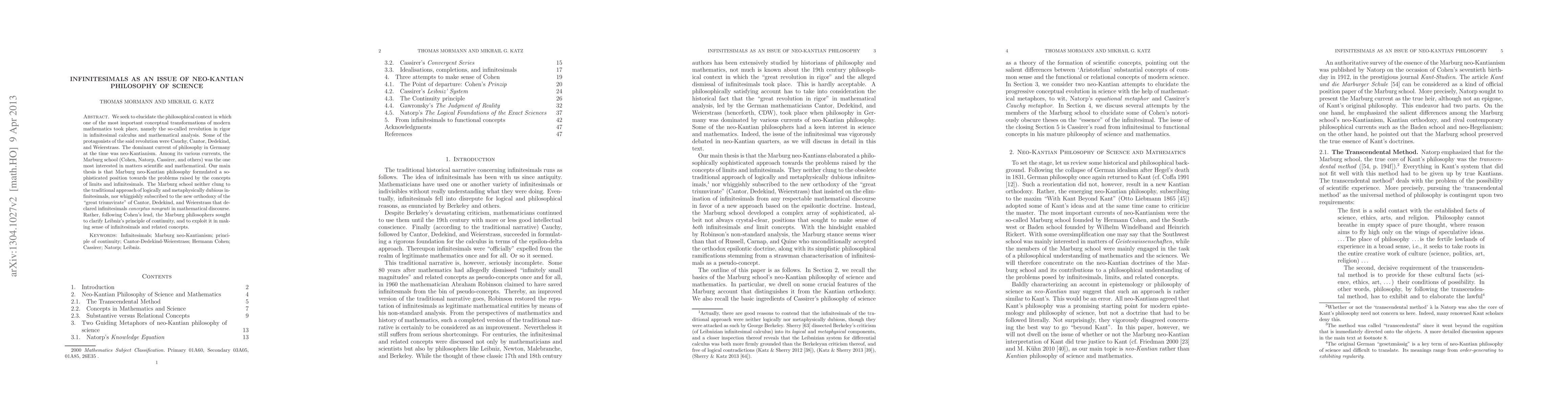 This paper explores how the Marburg school of neo-Kantian philosophy addressed the conceptual transformation in infinitesimal calculus, balancing traditional views with the new rigor of Cantor, Dedekind, and Weierstrass, while seeking to clarify Leibniz's principle of continuity.