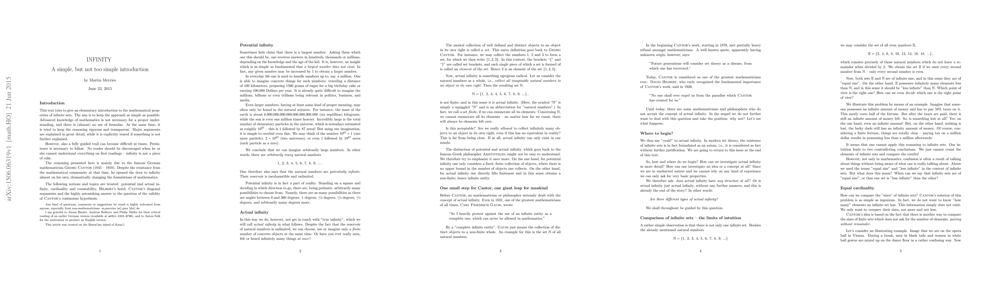 This paper provides a simplified introduction to infinite sets, explaining key concepts like infinity, cardinality, and Cantor's continuum hypothesis in an accessible way without advanced formulas.