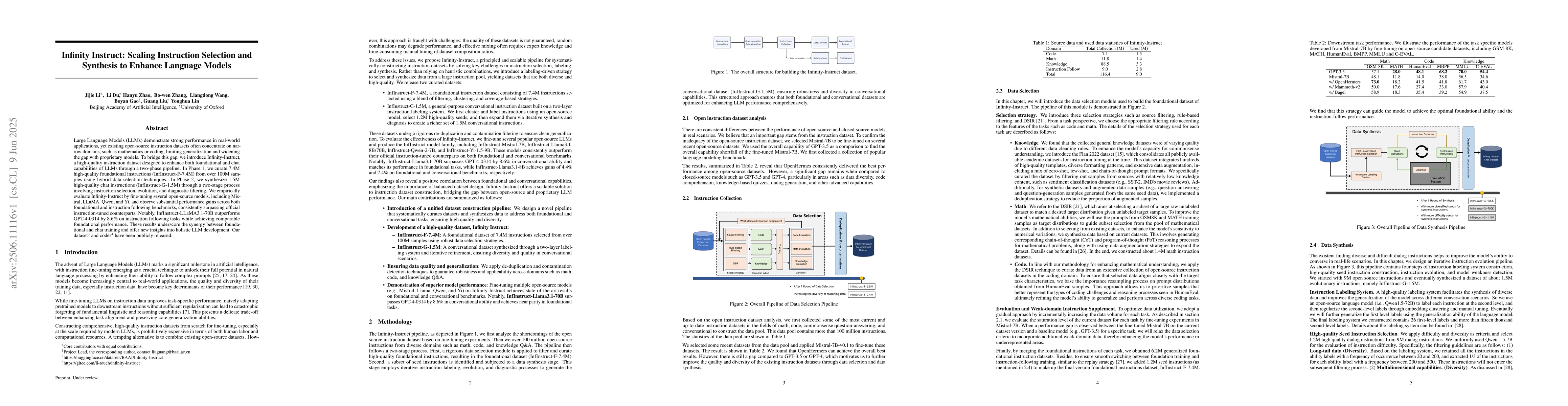 The paper introduces Infinity-Instruct, a large-scale instruction dataset for enhancing large language models (LLMs). It consists of 7.4M foundational instructions (InfInstruct-F-7.4M) and 1.5M chat instructions (InfInstruct-G-1.5M), curated through a two-phase pipeline. Experiments show significant performance improvements in both foundational and instruction-following tasks, with Infinity-Instruct-LLaMA3.1-70B outperforming GPT-4-0314 by 8.6% on instruction following tasks.