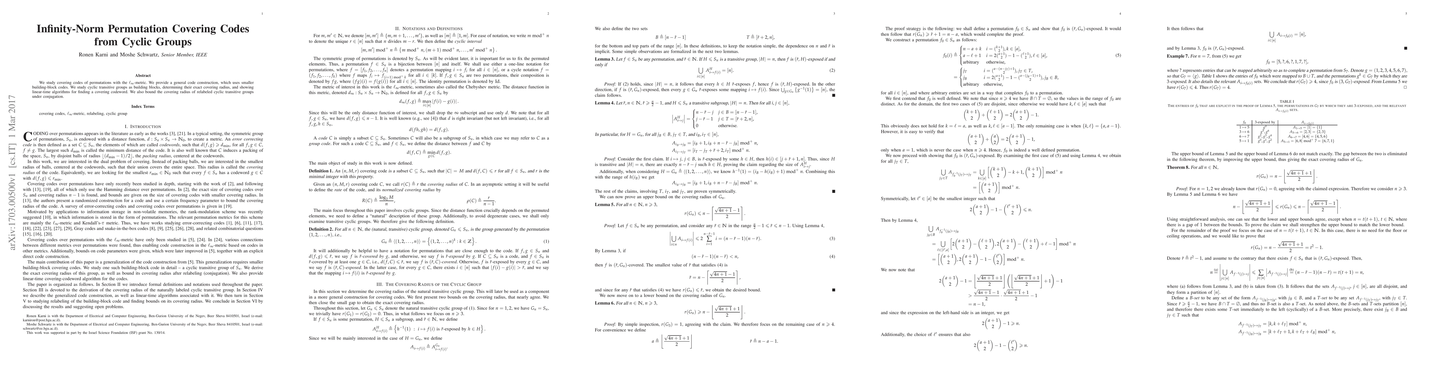 This paper explores covering codes for permutations using the $\ell_\infty$-metric, constructing them from cyclic transitive groups. It presents linear-time algorithms for finding optimal covering codewords and bounds the covering radius for relabeled cyclic transitive groups under conjugation.