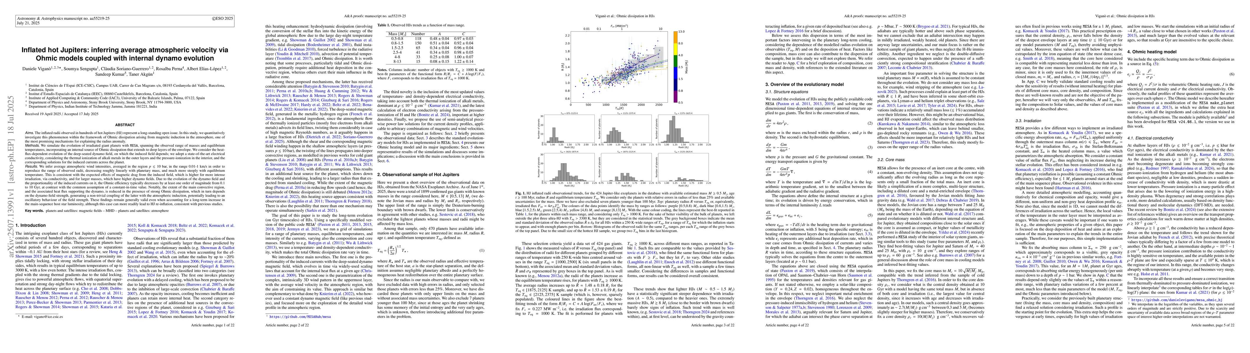 The inflated radii observed in hundreds of hot Jupiters (HJ) represent a long-standing open issue. In this study, we quantitatively investigate this phenomenon within the framework of Ohmic dissipation arising from magnetic induction in the atmosphere, one of the most promising mechanisms for explaining the radius anomaly. We simulate the evolution of irradiated giant planets with {\tt MESA}, spanning the observed range of masses and equilibrium temperatures, incorporating an internal source of Ohmic dissipation that extends to deep layers of the envelope. We infer average atmospheric wind intensities, averaged in the region $p\lesssim 10$ bar, in the range 0.01-1 km/s in order to reproduce the range of observed radii, decreasing roughly linearly with planetary mass, and much more steeply with equilibrium temperature. This is consistent with the expected effects of magnetic drag from the induced field, which is higher for more intense irradiation, via conductivity, and for larger masses, which have higher dynamo fields. Due to the evolution of the dynamo field and the proportionality of the induced currents on it, the Ohmic efficiency typically decreases by at least one order of magnitude from 0.1 to 10 Gyr, at contrast with the common assumption of a constant-in-time value. Notably, the extent of the main convective region, and the associated heat flux supporting the dynamo, is reduced in the presence of strong Ohmic dissipation, which in turn depends on the dynamo field strength, generating a non-trivial coupling of the latter with the atmospheric induction, potentially leading to an oscillatory behaviour of the field strength. These findings remain generally valid even when accounting for a long-term increase in the main-sequence host star luminosity, although this case can more readily lead to HJ re-inflation, consistent with previous studies.