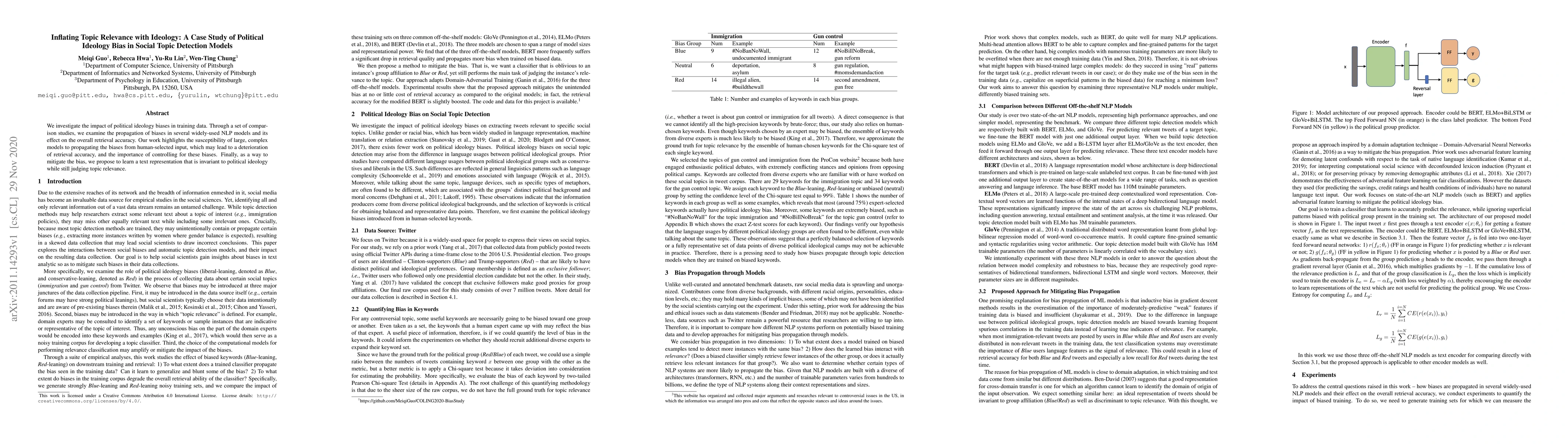 We investigate the impact of political ideology biases in training data. Through a set of comparison studies, we examine the propagation of biases in several widely-used NLP models and its effect on the overall retrieval accuracy. Our work highlights the susceptibility of large, complex models to propagating the biases from human-selected input, which may lead to a deterioration of retrieval accuracy, and the importance of controlling for these biases. Finally, as a way to mitigate the bias, we propose to learn a text representation that is invariant to political ideology while still judging topic relevance.