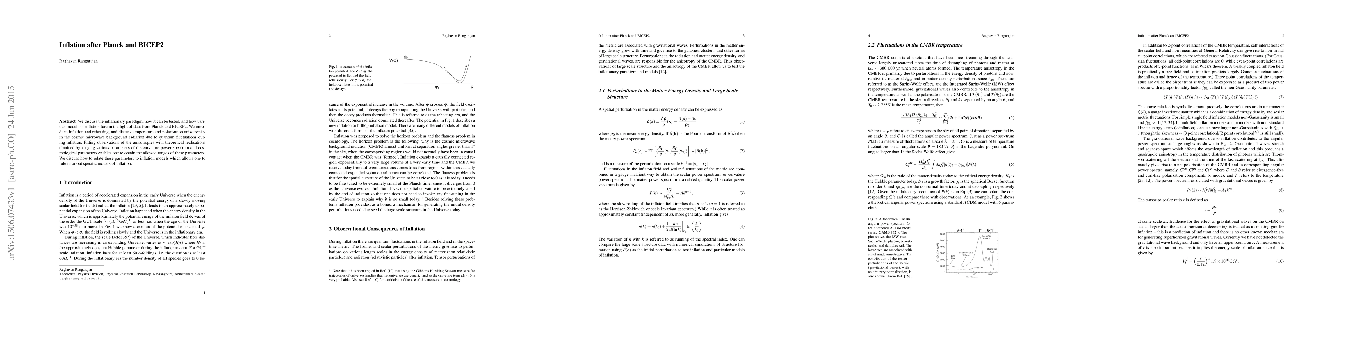 We discuss the inflationary paradigm, how it can be tested, and how various models of inflation fare in the light of data from Planck and BICEP2. We introduce inflation and reheating, and discuss temperature and polarisation anisotropies in the cosmic microwave background radiation due to quantum fluctuations during inflation. Fitting observations of the anisotropies with theoretical realisations obtained by varying various parameters of the curvature power spectrum and cosmological parameters enables one to obtain the allowed ranges of these parameters. We discuss how to relate these parameters to inflation models which allows one to rule in or out specific models of inflation.