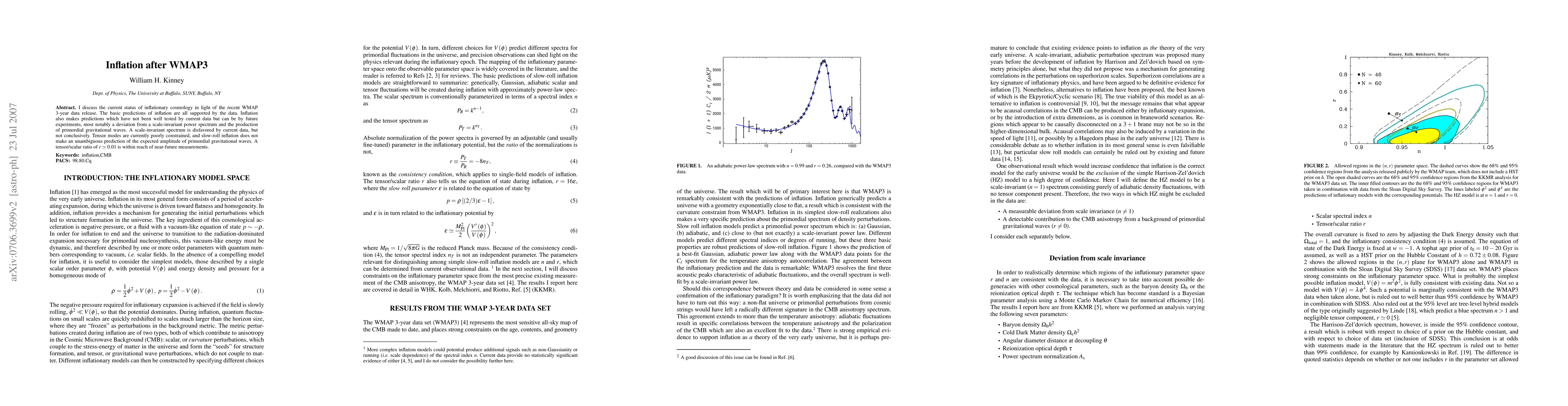 The WMAP 3-year data largely supports the basic predictions of inflationary cosmology, though a scale-invariant spectrum is disfavored but not conclusively. Future experiments may detect deviations from scale invariance and primordial gravitational waves, with a tensor/scalar ratio of $r \simeq 0.01$ within reach.