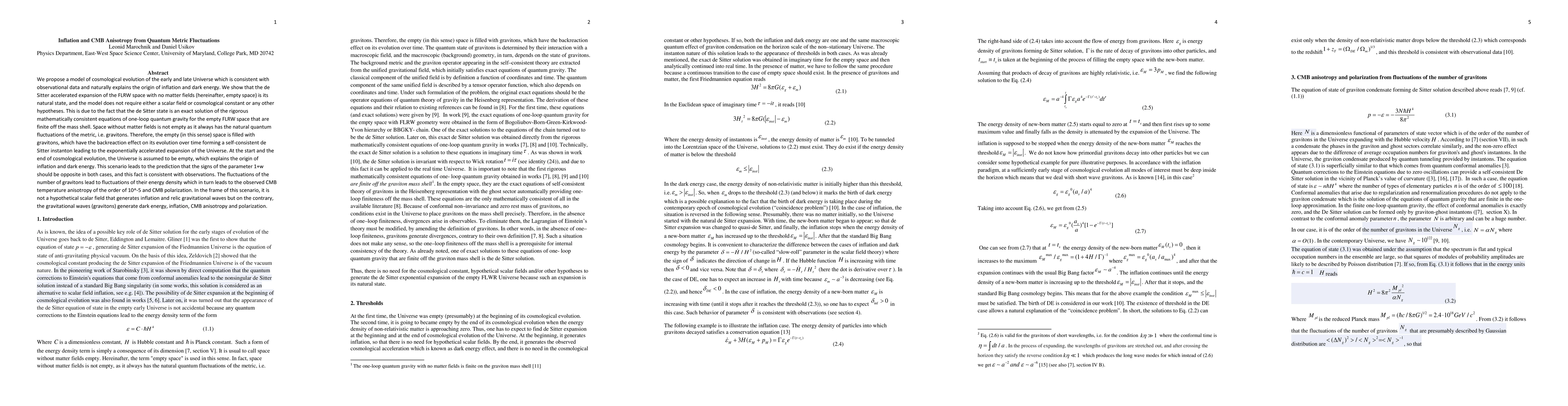 This paper proposes a cosmological model where the early and late Universe's accelerated expansion is driven by quantum metric fluctuations of gravitons, without requiring a scalar field or cosmological constant. The model predicts opposite signs for the parameter 1+w at the start and end of cosmological evolution, consistent with observations, and explains CMB anisotropy and polarization through graviton number fluctuations.