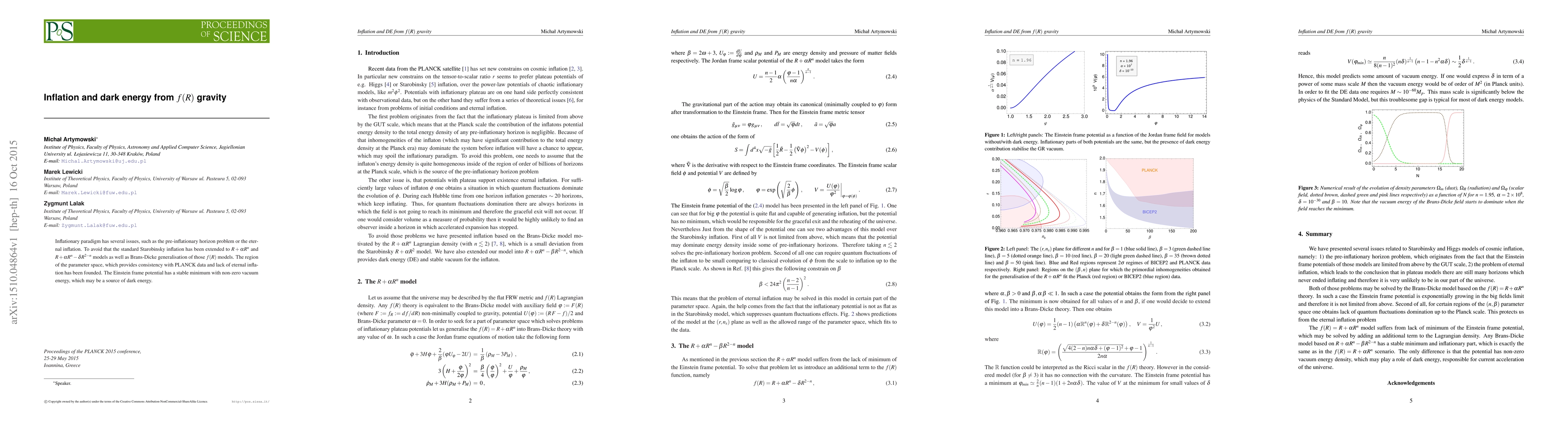 This paper explores $f(R)$ gravity models to address issues in the inflationary paradigm, identifying a parameter region that aligns with PLANCK data and avoids eternal inflation. It proposes a stable Einstein frame potential with non-zero vacuum energy, potentially explaining dark energy.