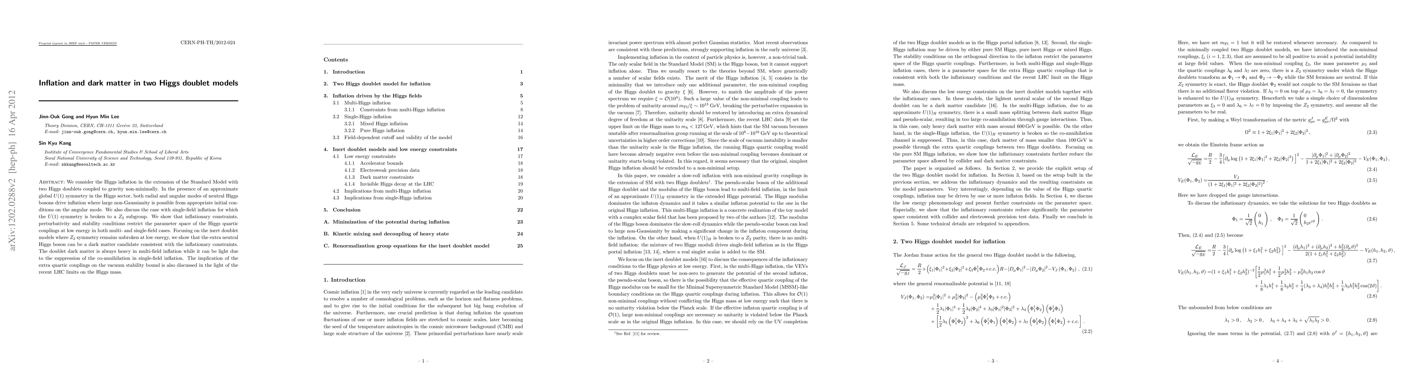 This paper explores Higgs inflation in two Higgs doublet models, demonstrating how both radial and angular modes of neutral Higgs bosons can drive inflation and potentially lead to large non-Gaussianity. It also investigates inert doublet models where the extra neutral Higgs boson can serve as a dark matter candidate, showing that its mass is influenced by the inflationary dynamics and the symmetry structure of the model.