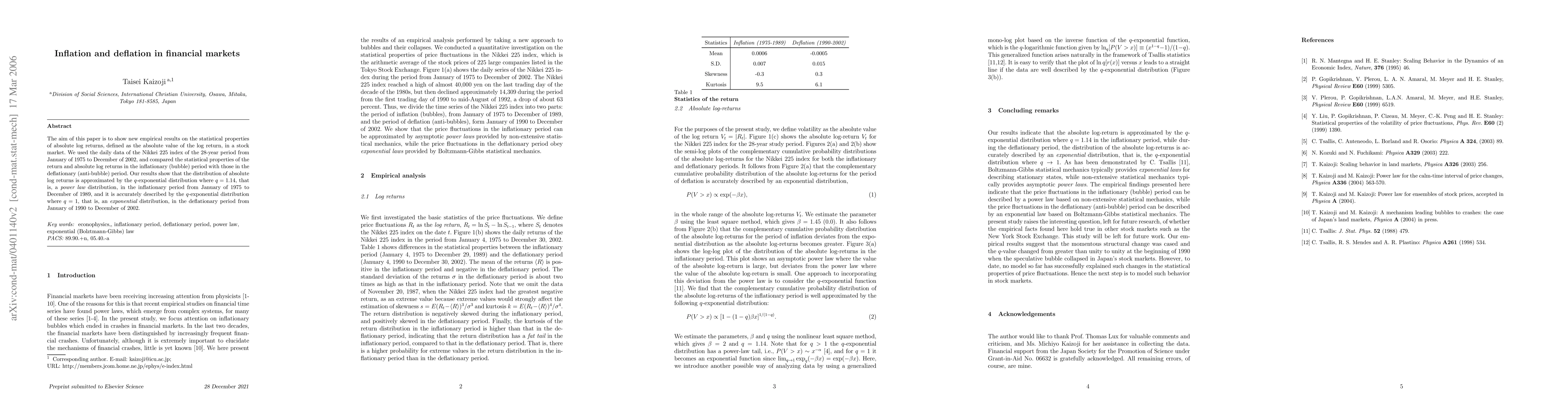 The aim of this paper is to compare statistical properties of a bubble period with those of the anti-bubble period in stock markets. We investigate the statistical properties of daily data for the Nikkei 225 index in the 28-year period from January 1975 to April 2003, corresponded to the periods of bubbles and anti-bubbles. We divide the time series into two parts, the period of {\it inflation (or bubbles)} from January 1975 to December 2002 and the period of {\it deflation (or anti-bubbles)} from January 1990 to December 2002. We find that the volatility in the inflationary period is approximated by the $q$-exponential distribution with $ q = 1.14 $ while the volatility distribution in the deflationary period is accurately described by an {\it exponential} distribution, that is, the $q$-exponential distribution with $ q \to 1 $. Our empirical findings suggest that the momentous structural changes have occurred at the beginning of 1990 when the speculative bubble was collapsed in the Japan's stock markets. Keywords: econophysics, inflationary period, deflationary period, power law, exponential (Bolztmann-Gibbs) law; PACS 89.90.+n; 05.40.-a;