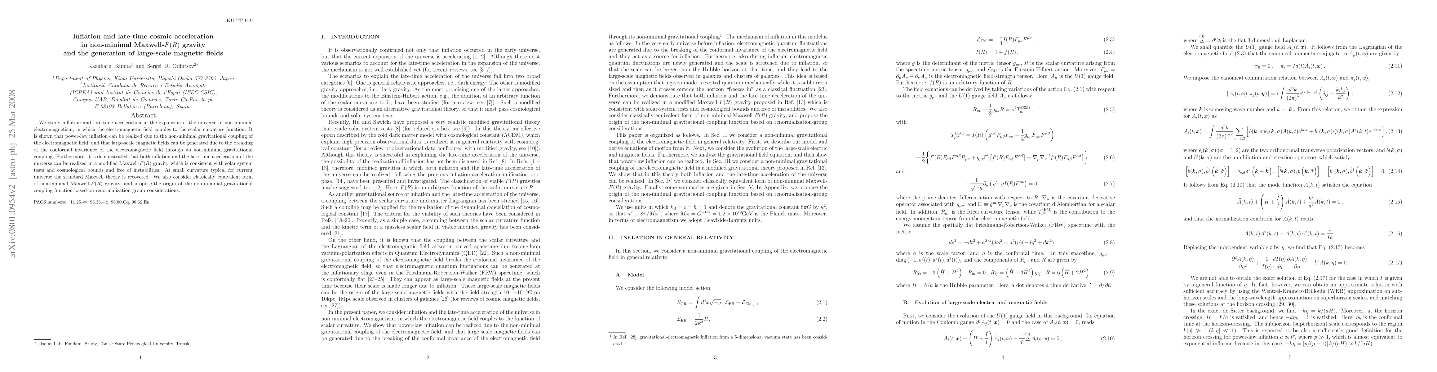 This paper explores inflation and late-time cosmic acceleration in non-minimal Maxwell-$F(R)$ gravity, demonstrating how such a framework can lead to power-law inflation and the generation of large-scale magnetic fields due to conformal invariance breaking. It proposes a consistent and stable model for both early and late universe expansion, grounded in renormalization-group considerations.