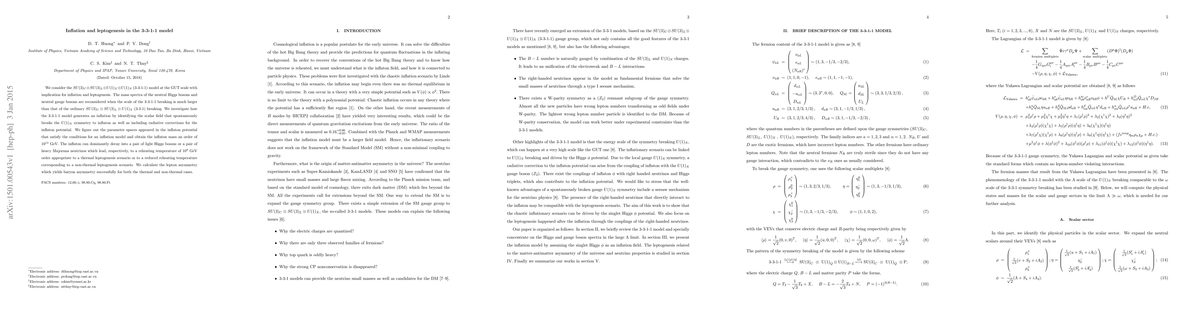 This paper explores the 3-3-1-1 model for inflation and leptogenesis, identifying a scalar field as the inflaton that breaks the U(1)_N symmetry and generates inflation. The model successfully calculates the lepton asymmetry that yields the baryon asymmetry through both thermal and non-thermal leptogenesis scenarios.