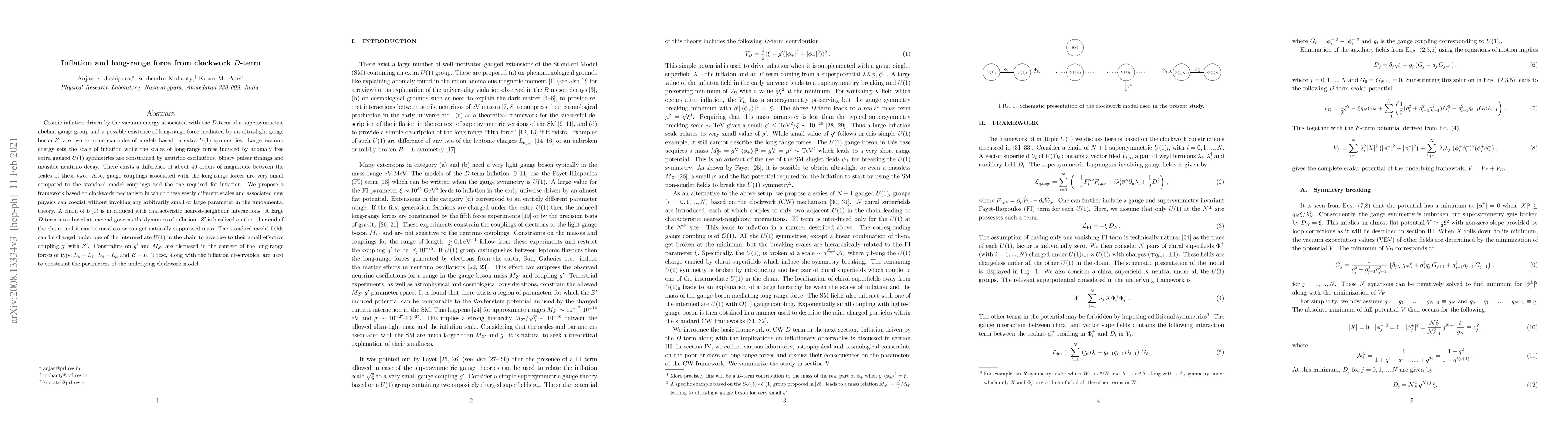 This research proposes a clockwork mechanism for cosmic inflation driven by the $D$-term of a supersymmetric abelian gauge group and the existence of a long-range force mediated by an ultra-light gauge boson $Z^\prime$. The framework introduces a chain of $U(1)$ symmetries that naturally accommodates the vast difference in scales between inflation and long-range forces, without requiring small or large parameters, and sets constraints on the gauge boson’s coupling and mass based on current observations.