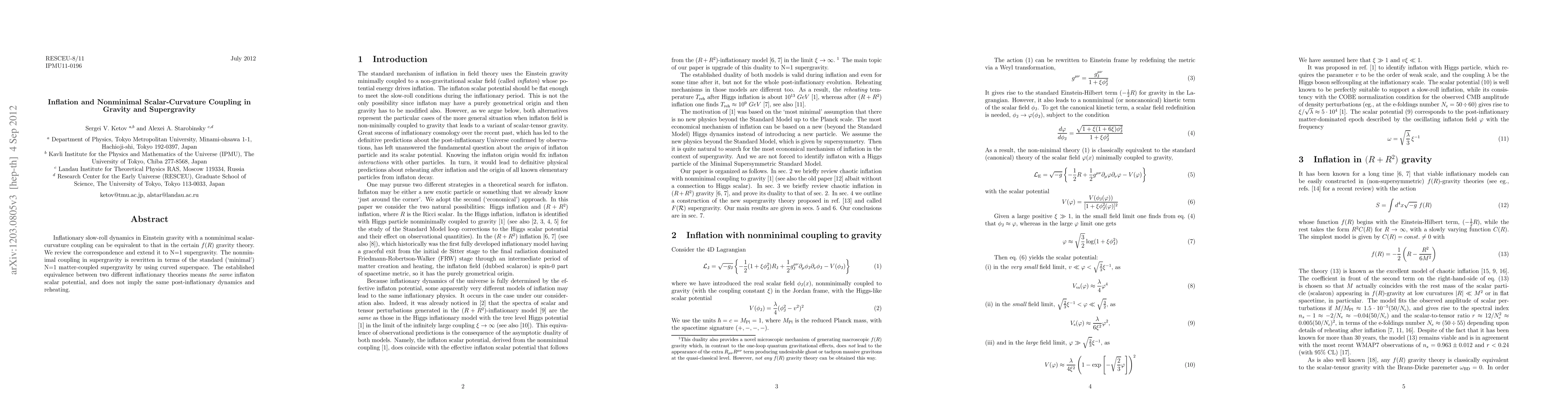 This paper explores the equivalence between inflationary dynamics in Einstein gravity with non-minimal scalar-curvature coupling and certain f(R) gravity theories, extending this correspondence to N=1 supergravity. It demonstrates that the non-minimal coupling can be reformulated in terms of standard N=1 matter-coupled supergravity, highlighting the same inflaton scalar potential but different post-inflationary dynamics.