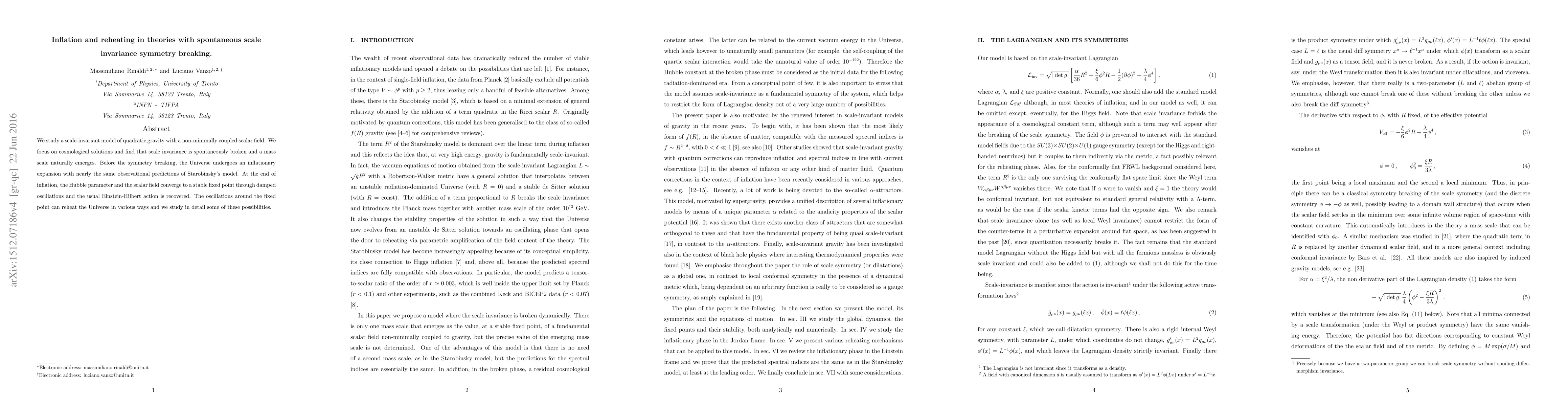 We study a scale-invariant model of quadratic gravity with a non-minimally coupled scalar field. We focus on cosmological solutions and find that scale invariance is spontaneously broken and a mass scale naturally emerges. Before the symmetry breaking, the Universe undergoes an inflationary expansion with nearly the same observational predictions of Starobinsky's model. At the end of inflation, the Hubble parameter and the scalar field converge to a stable fixed point through damped oscillations and the usual Einstein-Hilbert action is recovered. The oscillations around the fixed point can reheat the Universe in various ways and we study in detail some of these possibilities.