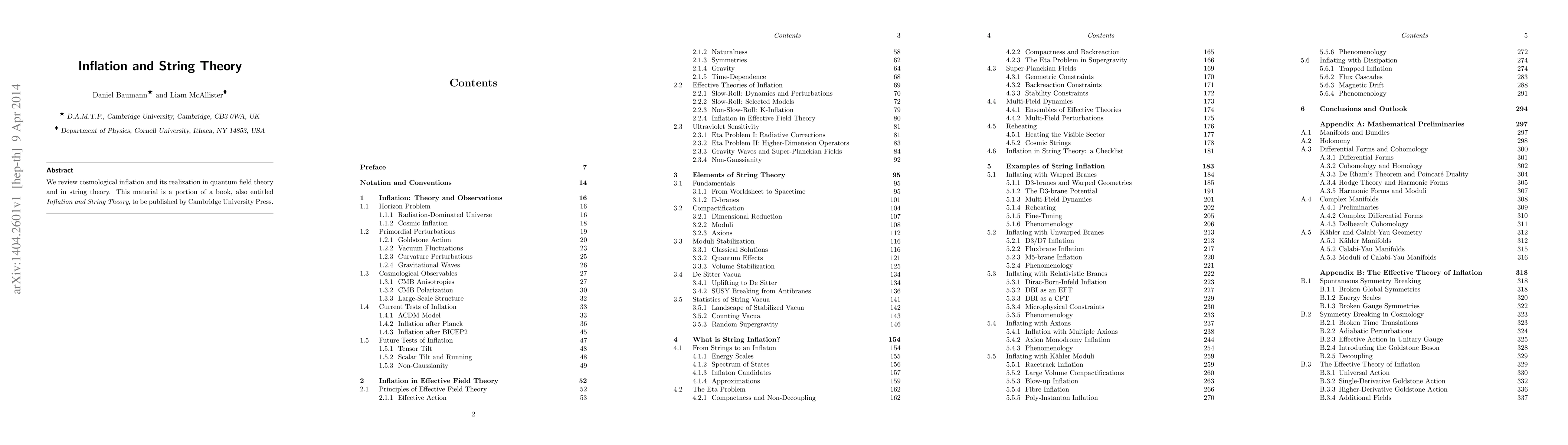 This paper reviews cosmological inflation, exploring its implementation in quantum field theory and string theory, with a focus on the broader context of a forthcoming book on the same topic by Cambridge University Press.