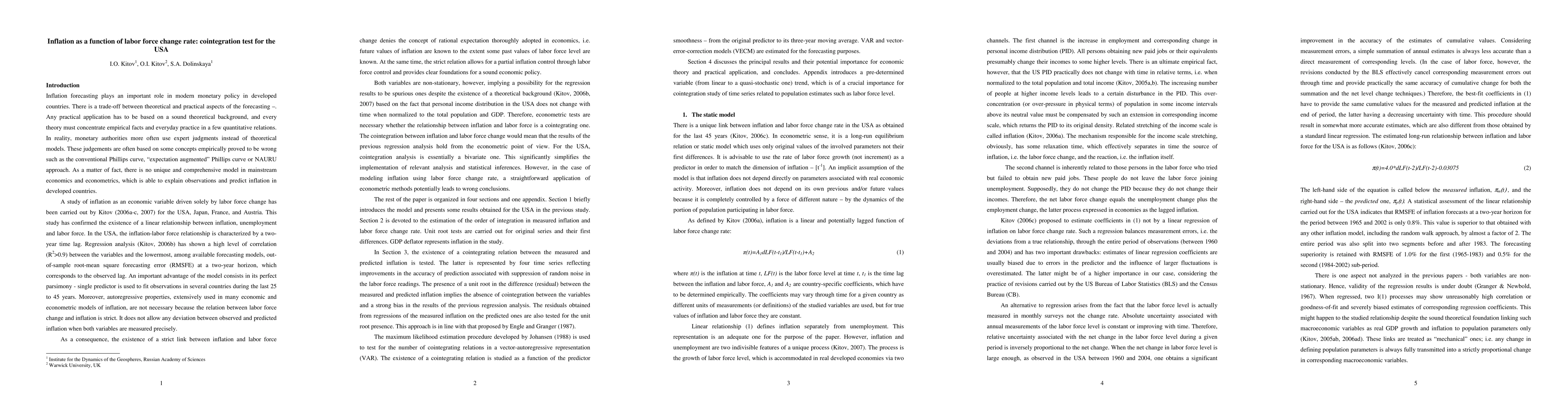 This study establishes a relationship between inflation and labor force change rate in the USA, demonstrating cointegration through the Engle-Granger and Johansen methods. The model forecasts inflation with a 0.8% RMSE over two years, outperforming other models, and suggests that improved labor force estimates can enhance predictive accuracy.