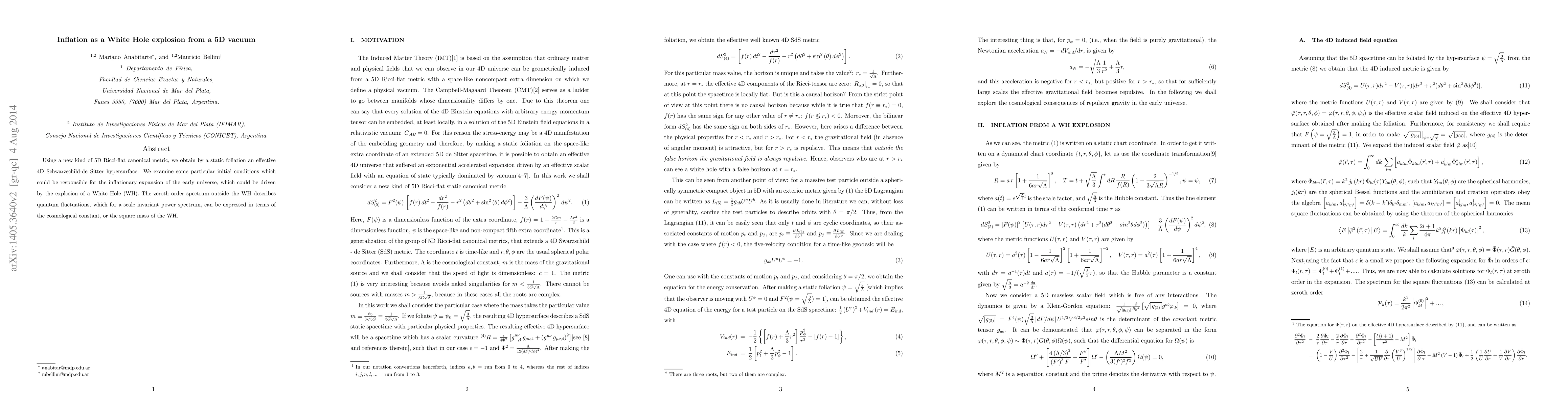 This paper explores a 5D vacuum model where inflation is driven by a White Hole explosion, using a 5D Ricci-flat canonical metric to derive an effective 4D Schwarzschild-de Sitter metric. It suggests that quantum fluctuations responsible for inflation can be linked to the cosmological constant or the square mass of the White Hole.