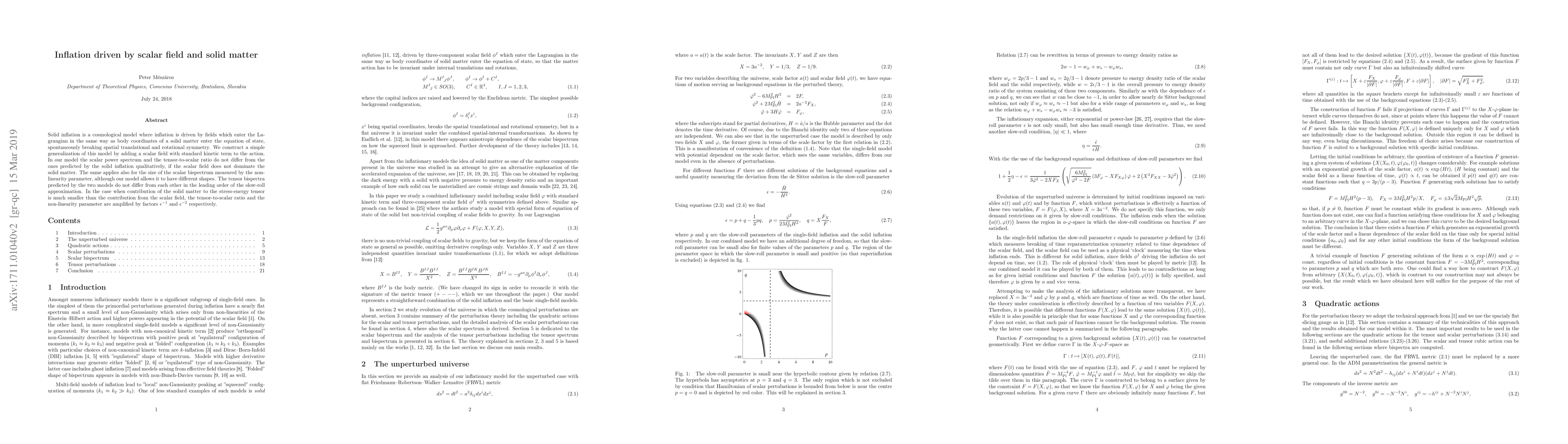 Solid inflation is a cosmological model where inflation is driven by fields which enter the Lagrangian in the same way as body coordinates of a solid matter enter the equation of state, spontaneously breaking spatial translational and rotational symmetry. We construct a simple generalization of this model by adding a scalar field with standard kinetic term to the action. In our model the scalar power spectrum and the tensor-to-scalar ratio do not differ from the ones predicted by the solid inflation qualitatively, if the scalar field does not dominate the solid matter. The same applies also for the size of the scalar bispectrum measured by the non-linearity parameter, although our model allows it to have different shapes. The tensor bispectra predicted by the two models do not differ from each other in the leading order of the slow-roll approximation. In the case when contribution of the solid matter to the stress-energy tensor is much smaller than the contribution from the scalar field, the tensor-to-scalar ratio and the non-linearity parameter are amplified by factors $\epsilon^{-1}$ and $\epsilon^{-2}$ respectively.