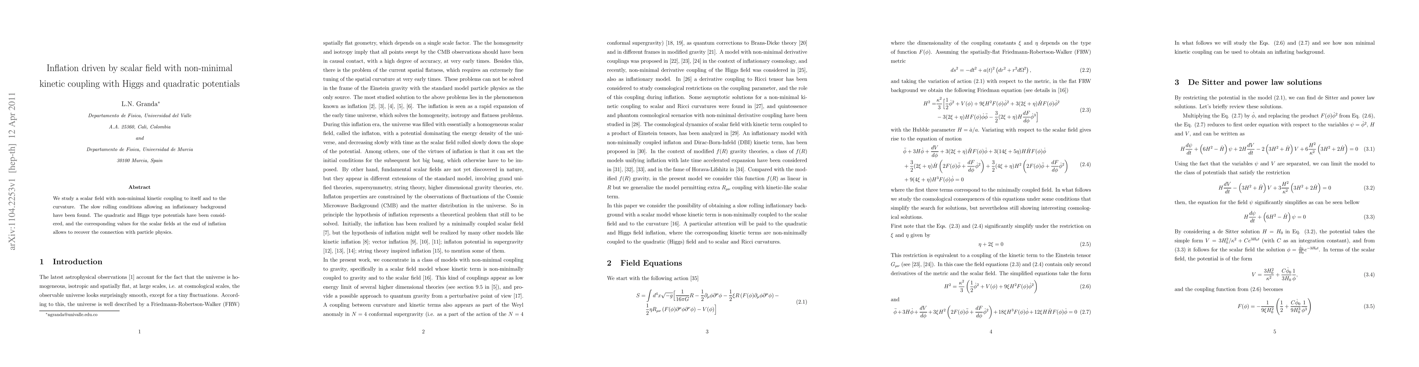 Summary: This paper investigates a scalar field with non-minimal kinetic coupling to both itself and the curvature, identifying slow rolling conditions for inflation. It explores quadratic and Higgs potentials, linking the scalar field's values at the end of inflation to particle physics.