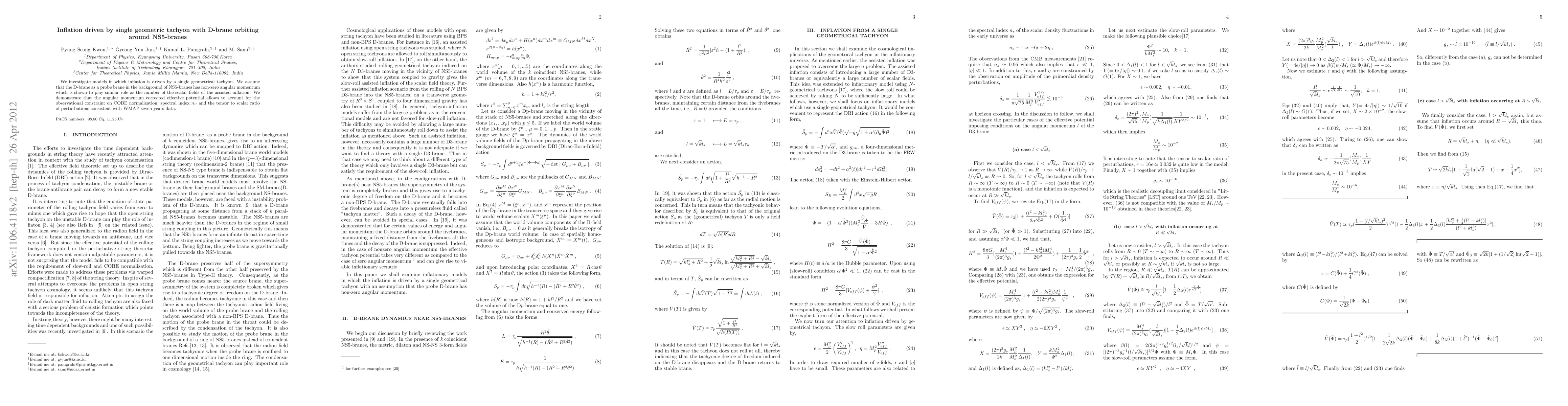 This paper explores inflationary models driven by a single geometric tachyon where a D-brane orbits around NS5-branes, attributing inflation to the D-brane's angular momentum. The study shows that this angular momentum can satisfy observational constraints on COBE normalization, spectral index, and the tensor-to-scalar ratio, aligning with WMAP data.