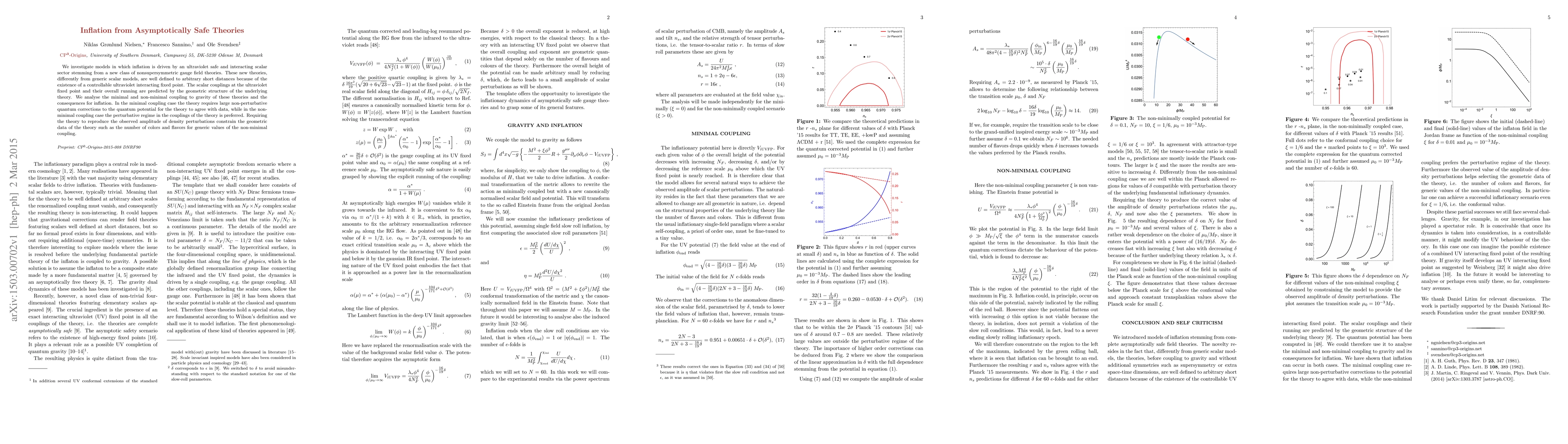 We investigate models in which inflation is driven by an ultraviolet safe and interacting scalar sector stemming from a new class of nonsupersymmetric gauge field theories. These new theories, differently from generic scalar models, are well defined to arbitrary short distances because of the existence of a controllable ultraviolet interacting fixed point. The scalar couplings at the ultraviolet fixed point and their overall running are predicted by the geometric structure of the underlying theory. We analyse the minimal and non-minimal coupling to gravity of these theories and the consequences for inflation. In the minimal coupling case the theory requires large non-perturbative quantum corrections to the quantum potential for the theory to agree with data, while in the non- minimal coupling case the perturbative regime in the couplings of the theory is preferred. Requiring the theory to reproduce the observed amplitude of density perturbations constrain the geometric data of the theory such as the number of colors and flavors for generic values of the non-minimal coupling.