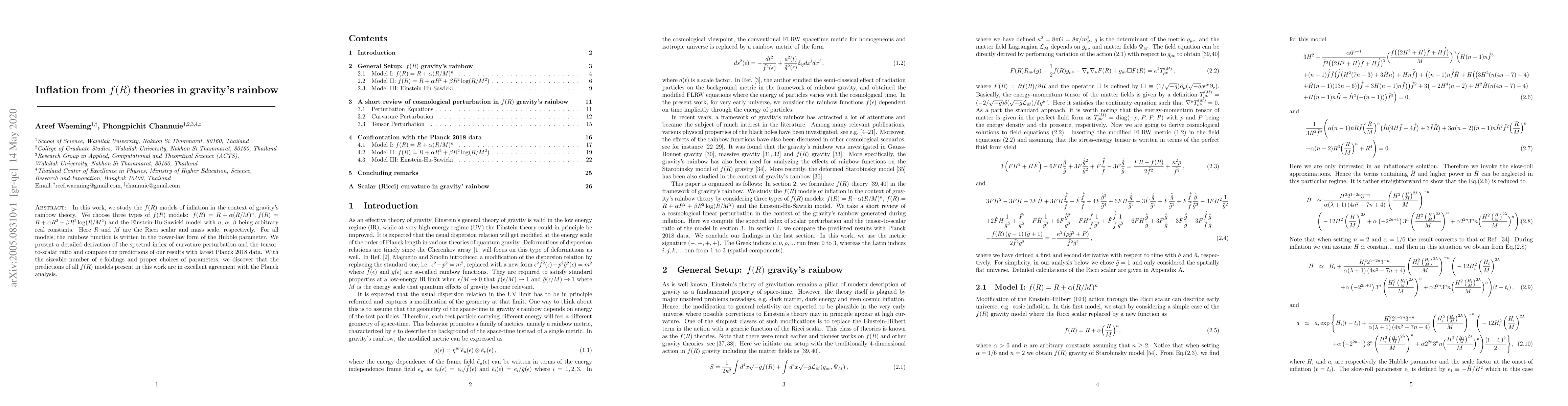 This paper investigates inflationary scenarios within $f(R)$ gravity models under gravity's rainbow theory, deriving the spectral index and tensor-to-scalar ratio for three specific $f(R)$ forms. The results align well with the latest Planck 2018 data, indicating compatibility of these models with observational cosmology.