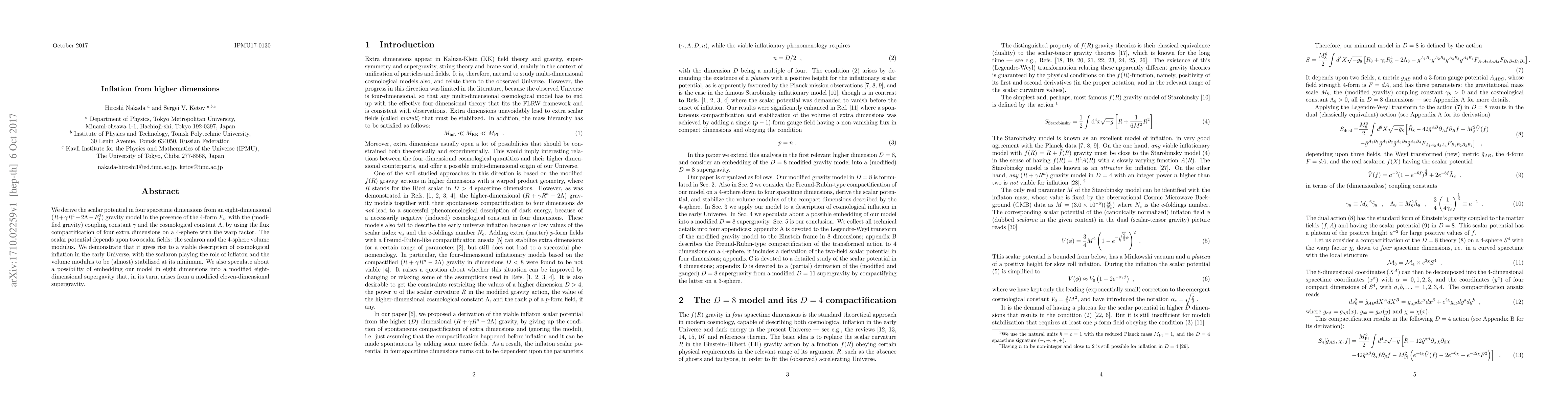 This paper proposes a four-dimensional gravity model with an eight-dimensional parent theory that leads to inflation in the early Universe, with the scalaron playing the role of inflaton.