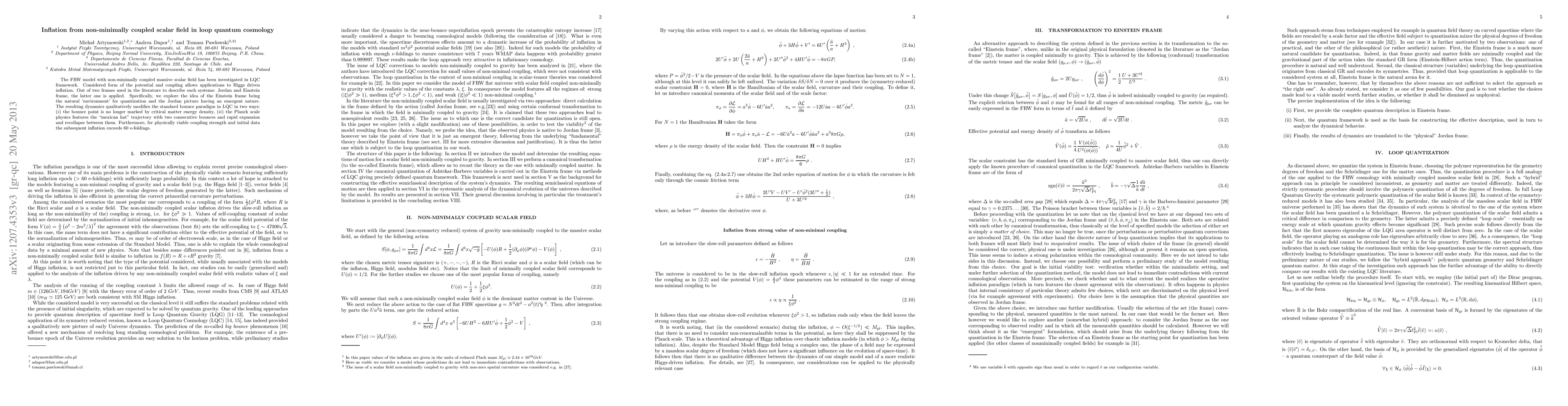 The FRW model with non-minimally coupled massive scalar field has been investigated in LQC framework. Considered form of the potential and coupling allows applications to Higgs driven inflation. Out of two frames used in the literature to describe such systems: Jordan and Einstein frame, the latter one is applied. Specifically, we explore the idea of the Einstein frame being the natural 'environment' for quantization and the Jordan picture having an emergent nature. The resulting dynamics qualitatively modifies the standard bounce paradigm in LQC in two ways: (i) the bounce point is no longer marked by critical matter energy density, (ii) the Planck scale physics features the 'mexican hat' trajectory with two consecutive bounces and rapid expansion and recollapse between them. Furthermore, for physically viable coupling strength and initial data the subsequent inflation exceeds 60 e-foldings.