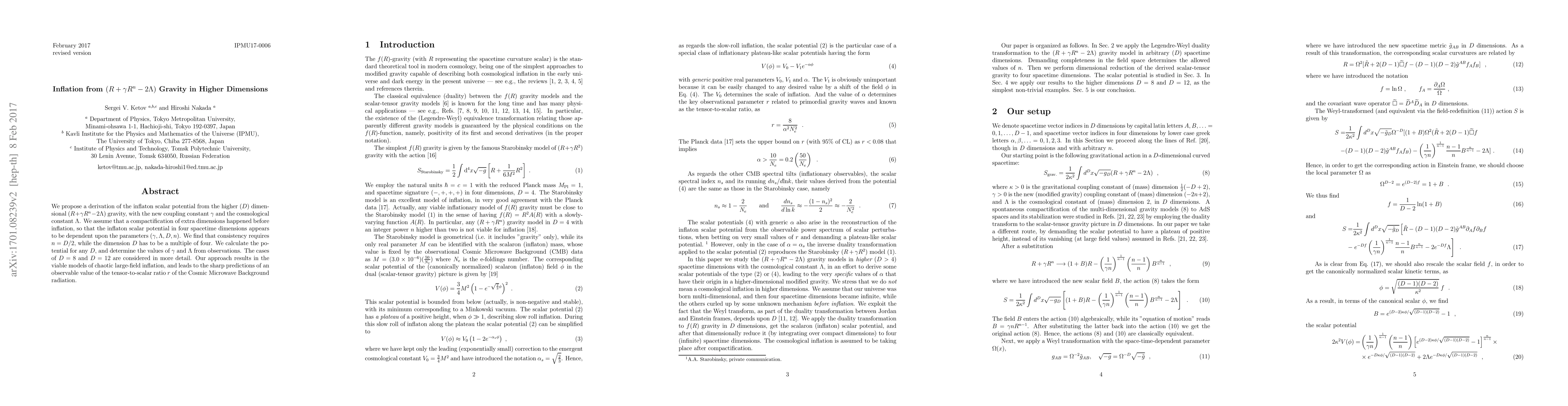 We propose a derivation of the inflaton scalar potential from the higher $(D)$ dimensional $(R+\gamma R^n-2\Lambda)$ gravity, with the new coupling constant $\gamma$ and the cosmological constant $\Lambda$. We assume that a compactification of extra dimensions happened before inflation, so that the inflaton scalar potential in four spacetime dimensions appears to be dependent upon the parameters $(\gamma,\Lambda ,D,n)$. We find that consistency requires $n=D/2$, while the dimension $D$ has to be a multiple of four. We calculate the potential for any $D$, and determine the values of $\gamma$ and $\Lambda$ from observations. The cases of $D=8$ and $D=12$ are considered in more detail. Our approach results in the viable models of chaotic large-field inflation, and leads to the sharp predictions of an observable value of the tensor-to-scalar ratio $r$ of the Cosmic Microwave Background radiation.