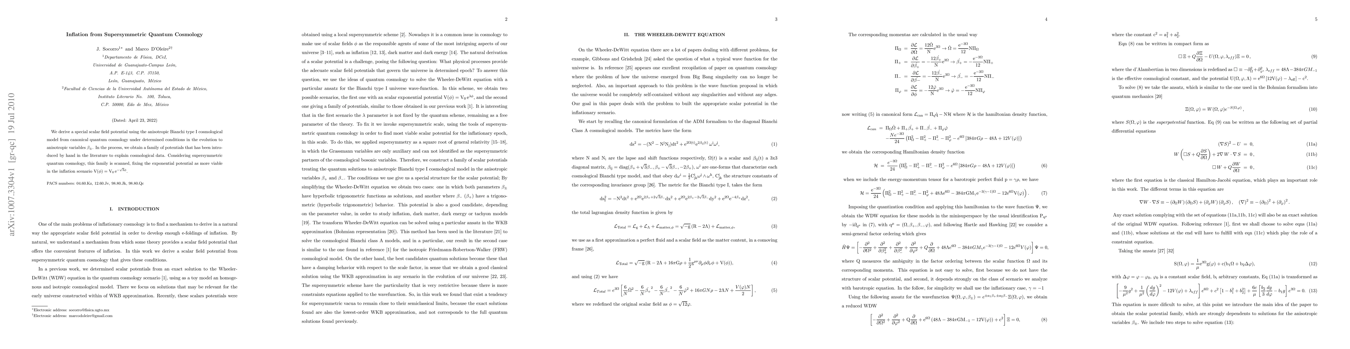 This paper derives a scalar field potential from supersymmetric quantum cosmology within an anisotropic Bianchi type I model, identifying an exponential potential, $\rm V (\phi) = V_0 \,e^{-\sqrt{3}\phi}$, as particularly viable for explaining inflationary dynamics.