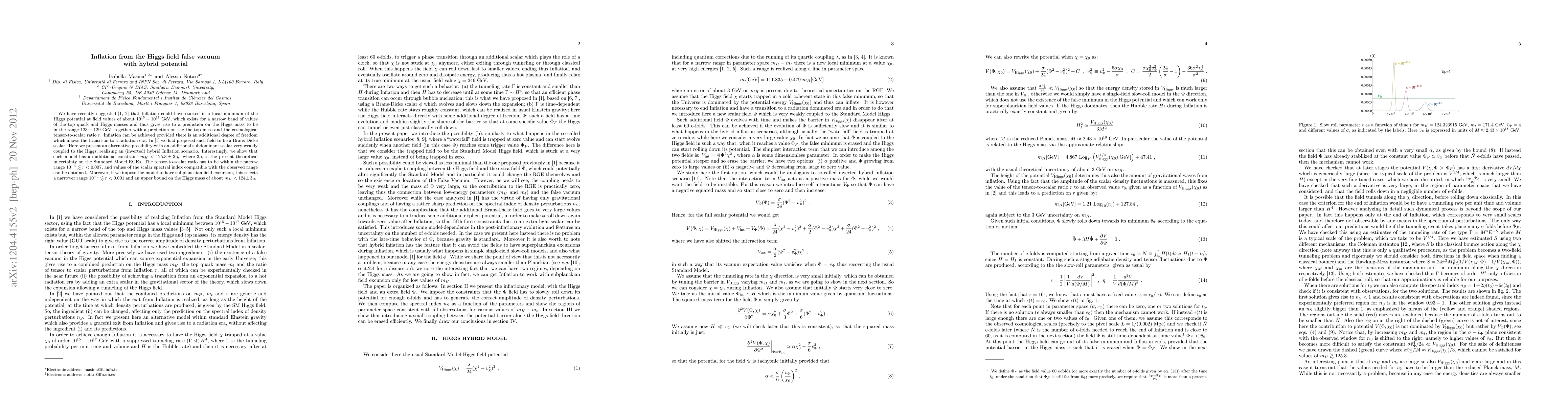 We have recently suggested [1,2] that Inflation could have started in a local minimum of the Higgs potential at field values of about $10^{15}-10^{17}$ GeV, which exists for a narrow band of values of the top quark and Higgs masses and thus gives rise to a prediction on the Higgs mass to be in the range 123-129 GeV, together with a prediction on the the top mass and the cosmological tensor-to-scalar ratio $r$. Inflation can be achieved provided there is an additional degree of freedom which allows the transition to a radiation era. In [1] we had proposed such field to be a Brans-Dicke scalar. Here we present an alternative possibility with an additional subdominant scalar very weakly coupled to the Higgs, realizing an (inverted) hybrid Inflation scenario. Interestingly, we show that such model has an additional constraint $m_H<125.3 \pm 3_{th}$, where $3_{th}$ is the present theoretical uncertainty on the Standard Model RGEs. The tensor-to-scalar ratio has to be within the narrow range $10^{-4}\lesssim r<0.007$, and values of the scalar spectral index compatible with the observed range can be obtained. Moreover, if we impose the model to have subplanckian field excursion, this selects a narrower range $10^{-4} \lesssim r<0.001$ and an upper bound on the Higgs mass of about $m_H <124 \pm 3_{th}$.