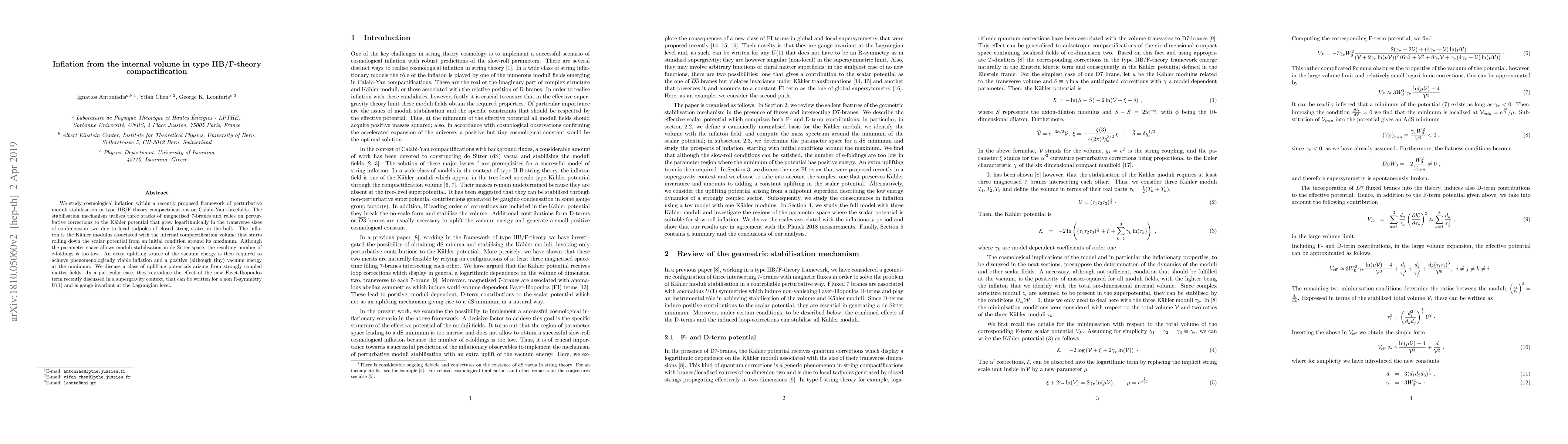 We study cosmological inflation within a recently proposed framework of perturbative moduli stabilisation in type IIB/F theory compactifications on Calabi-Yau threefolds. The stabilisation mechanism utilises three stacks of magnetised 7-branes and relies on perturbative corrections to the K\"ahler potential that grow logarithmically in the transverse sizes of co-dimension two due to local tadpoles of closed string states in the bulk. The inflaton is the K\"ahler modulus associated with the internal compactification volume that starts rolling down the scalar potential from an initial condition around its maximum. Although the parameter space allows moduli stabilisation in de Sitter space, the resulting number of e-foldings is too low. An extra uplifting source of the vacuum energy is then required to achieve phenomenologically viable inflation and a positive (although tiny) vacuum energy at the minimum. Here we use, as an example, a new Fayet-Iliopoulos term proposed recently in supergravity that can be written for a non R-symmetry U(1) and is gauge invariant at the Lagrangian level; its possible origin though in string theory remains an open interesting problem.