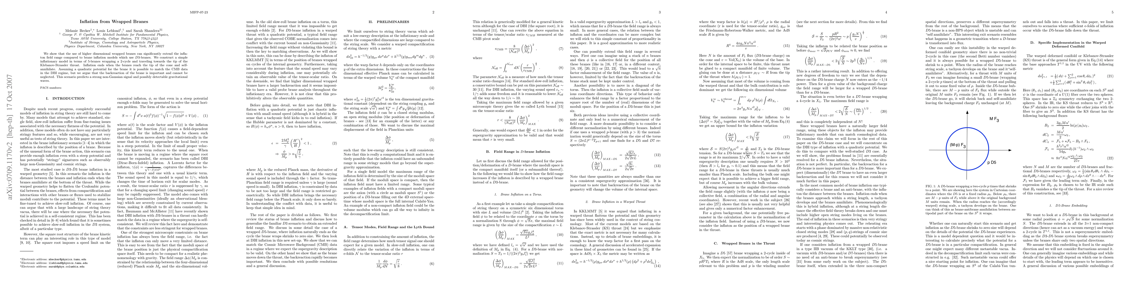 We show that the use of higher dimensional wrapped branes can significantly extend the inflaton field range compared to brane inflation models which use D3-branes. We construct a simple inflationary model in terms of 5-branes wrapping a 2-cycle and traveling towards the tip of the Klebanov-Strassler throat. Inflation ends when the branes reach the tip of the cone and self-annihilate. Assuming a quadratic potential for the brane it is possible to match the CMB data in the DBI regime, but we argue that the backreaction of the brane is important and cannot be neglected. This scenario predicts a strong non-Gaussian signal and possibly detectable gravitational waves.