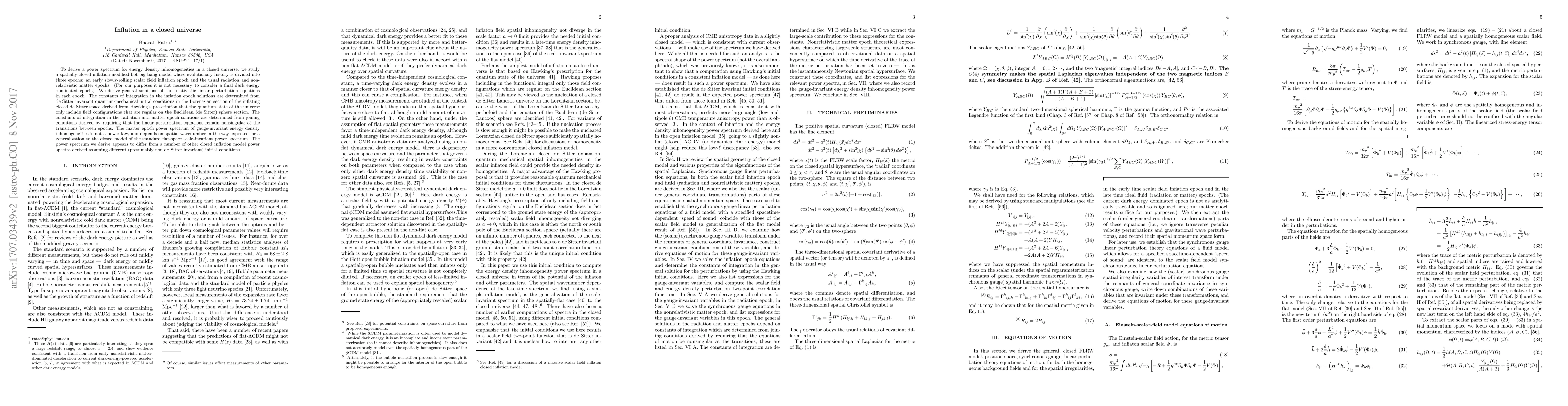 This paper derives a power spectrum for energy density inhomogeneities in a closed inflationary universe, solving relativistic linear perturbation equations across three epochs: inflation, radiation, and matter. It uses de Sitter invariant quantum initial conditions for inflation and nonsingular joining conditions for epoch transitions, resulting in a non-power law matter epoch power spectrum differing from other closed inflation models.