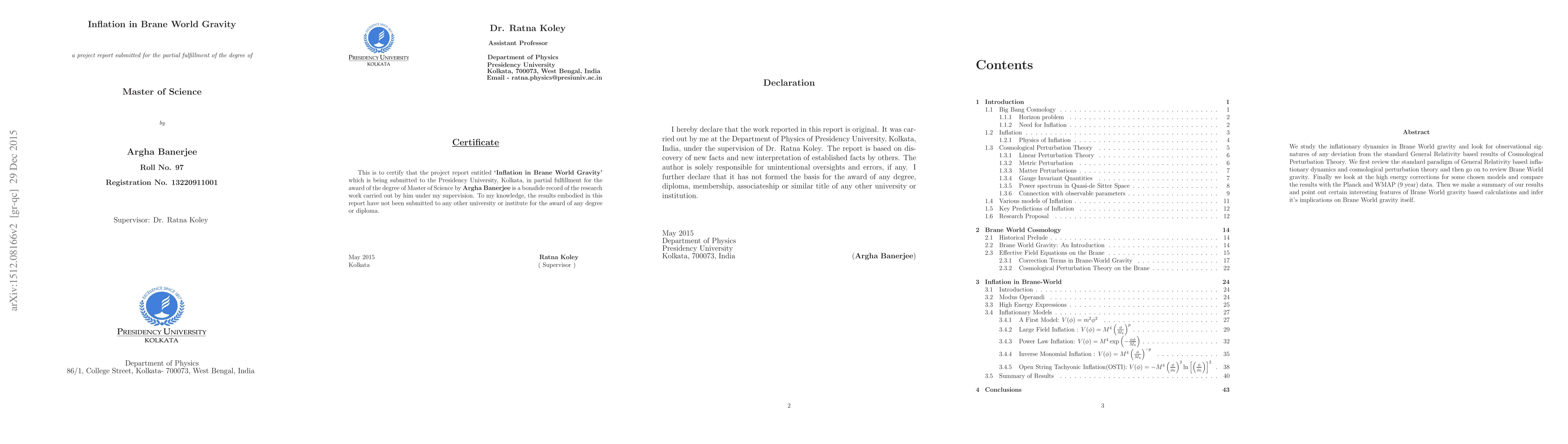 We study the inflationary dynamics in Brane World gravity and look for observational signatures of any deviation from the standard General Relativity based results of Cosmological Perturbation Theory. We first review the standard paradigm of General Relativity based inflationary dynamics and cosmological perturbation theory and then go on to review Brane World gravity. Finally we look at the high energy corrections for some chosen models and compare the results with the Planck and WMAP (9 year) data. Then we make a summary of our results and point out certain interesting features of Brane World gravity based calculations and infer it's implications on Brane World gravity itself.