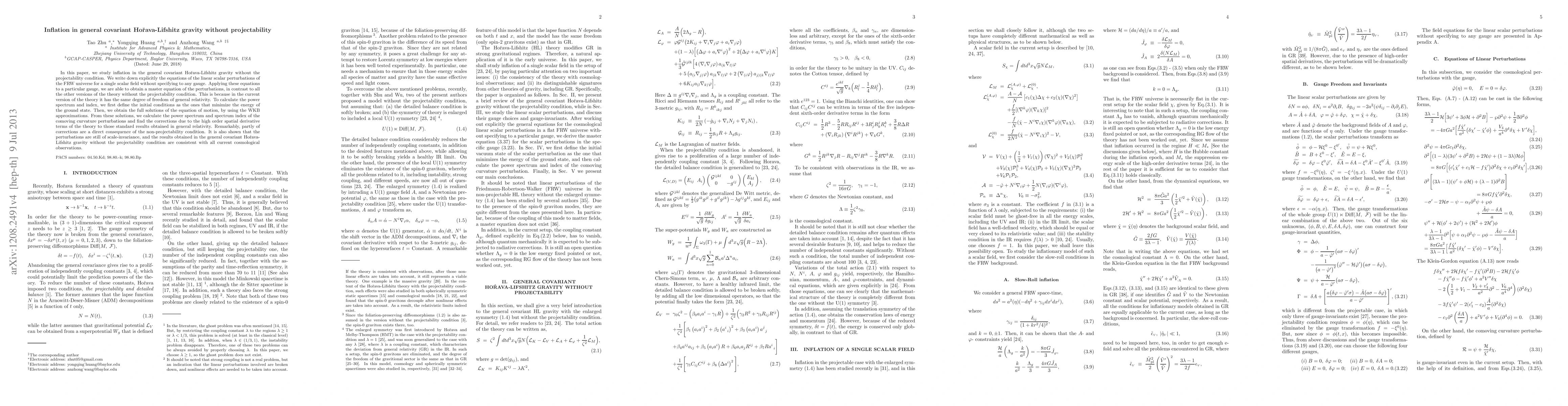 This paper investigates inflation in a general covariant Hořava-Lifshitz gravity model without the projectability condition, deriving the master equation for scalar perturbations and calculating the power spectrum and spectral index. The results show corrections from high-order spatial derivatives and confirm consistency with current cosmological observations.