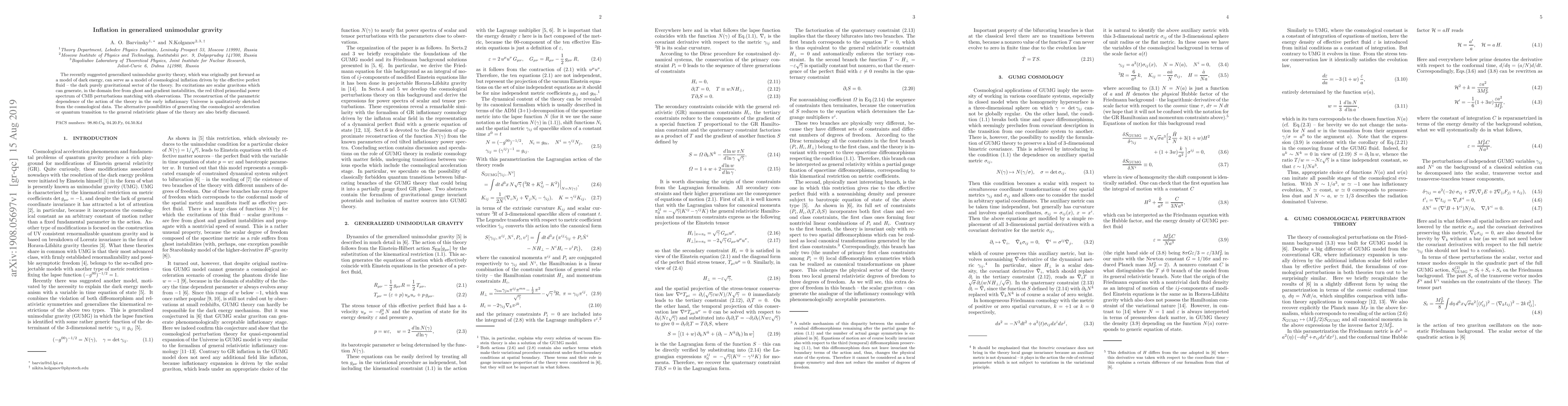 The recently suggested generalized unimodular gravity theory, which was originally put forward as a model of dark energy, can serve as a model of cosmological inflation driven by the effective perfect fluid -- the dark purely gravitational sector of the theory. Its excitations are scalar gravitons which can generate, in the domain free from ghost and gradient instabilities, the red tilted primordial power spectrum of CMB perturbations matching with observations. The reconstruction of the parametric dependence of the action of the theory in the early inflationary Universe is qualitatively sketched from the cosmological data. The alternative possibilities of generating the cosmological acceleration or quantum transition to the general relativistic phase of the theory are also briefly discussed.