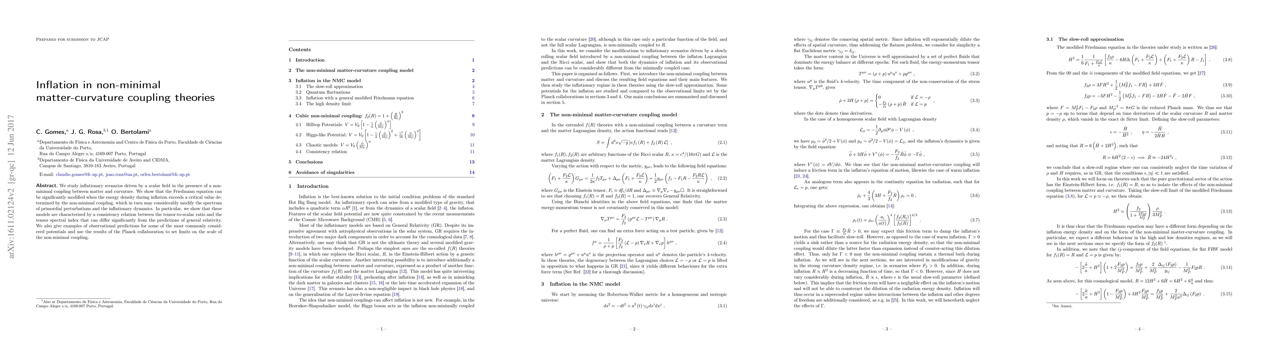 We study inflationary scenarios driven by a scalar field in the presence of a non-minimal coupling between matter and curvature. We show that the Friedmann equation can be significantly modified when the energy density during inflation exceeds a critical value determined by the non-minimal coupling, which in turn may considerably modify the spectrum of primordial perturbations and the inflationary dynamics. In particular, we show that these models are characterised by a consistency relation between the tensor-to-scalar ratio and the tensor spectral index that can differ significantly from the predictions of general relativity. We also give examples of observational predictions for some of the most commonly considered potentials and use the results of the Planck collaboration to set limits on the scale of the non-minimal coupling.